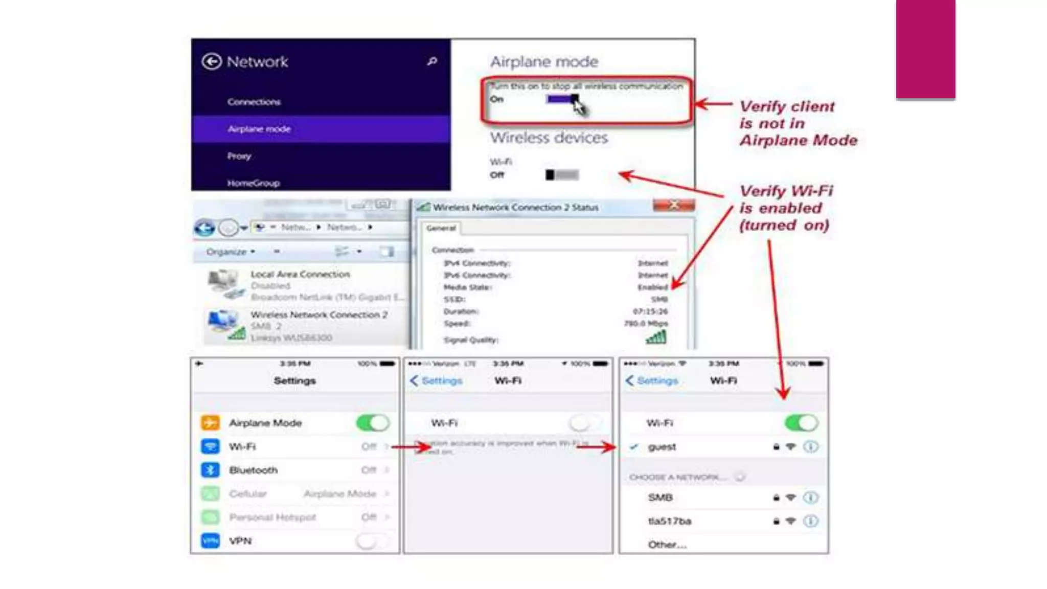 2. Verify the wireless adapter on the device is turned on and not in airplane mode.