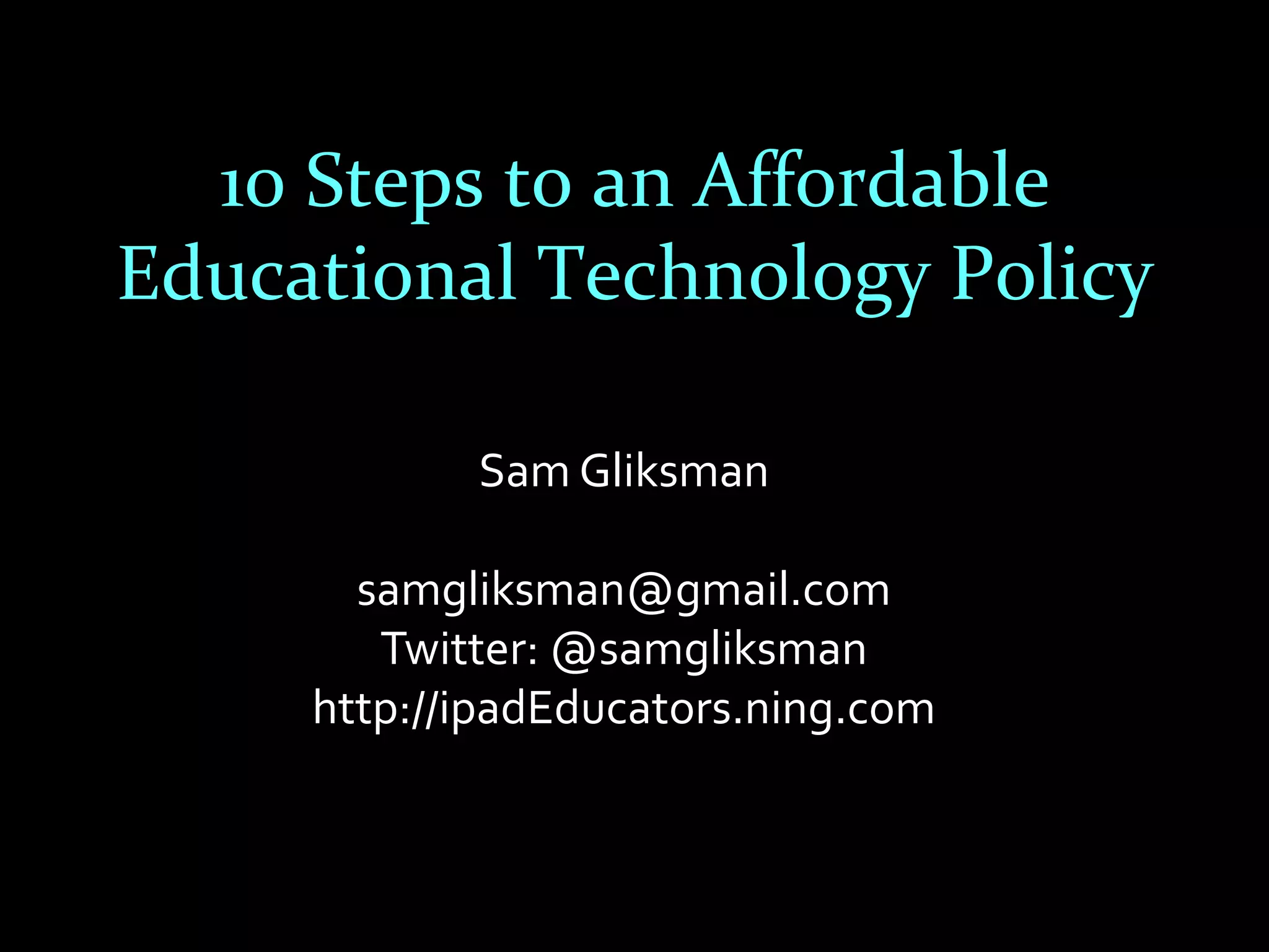 The document outlines a 10-step plan for developing an affordable and effective educational technology policy. It emphasizes clarifying educational vision, investing in infrastructure, adopting flexible technology models, and integrating virtual learning environments to meet 21st-century educational needs. The significance of adaptability and a shift from traditional resources to modern, technology-driven methods is stressed to prepare students for future challenges.