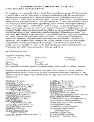 The document provides instructions for Twelfth Grade English students' summer reading assignment. Students must read Ralph Ellison's novel "Invisible Man" and write a 10-paragraph paper analyzing 10 quotes from the book. They are given guidelines on selecting meaningful quotes that demonstrate a full reading of the novel. Additionally, the document offers general advice to students to make reading a daily habit and to explore a variety of materials to read. It provides suggestions for magazines, novels, and short stories that would be appropriate summer reading.