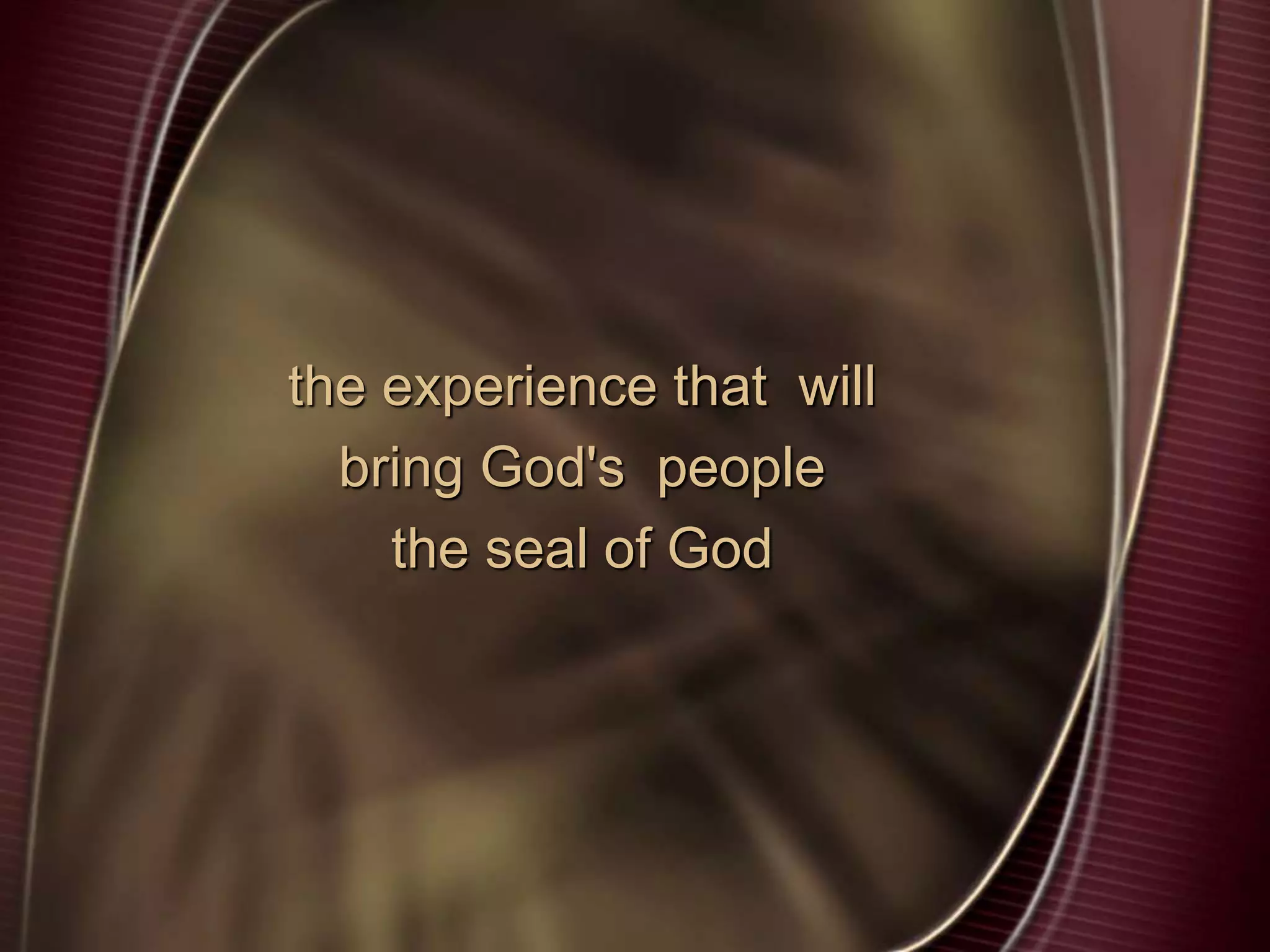 The document discusses the experience that will bring God's people the seal of God. It describes how God's people will recognize their own sinfulness and unworthiness during the investigative judgment. Jesus will take away their filthy garments and clothe them with his robe of righteousness. They will receive the seal of God and be eternally secure from the tempter's devices, protected by holy angels.