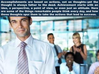 Successful people take actions that lead to accomplishments rather than just having thoughts. Some actions they take include volunteering to gain opportunities, looking deeper at other's actions, overcoming fears, doing things others won't do to stand out, taking action now rather than hesitating, asking others for help, offering help to others, living life their own way despite others' opinions, doing grunt work themselves, learning from role models, saying yes to opportunities and no when needed, staying true to themselves through their actions for others, and persisting with effort when facing challenges. The overall message is that thoughts alone do not create success and accomplishments come through taking action.