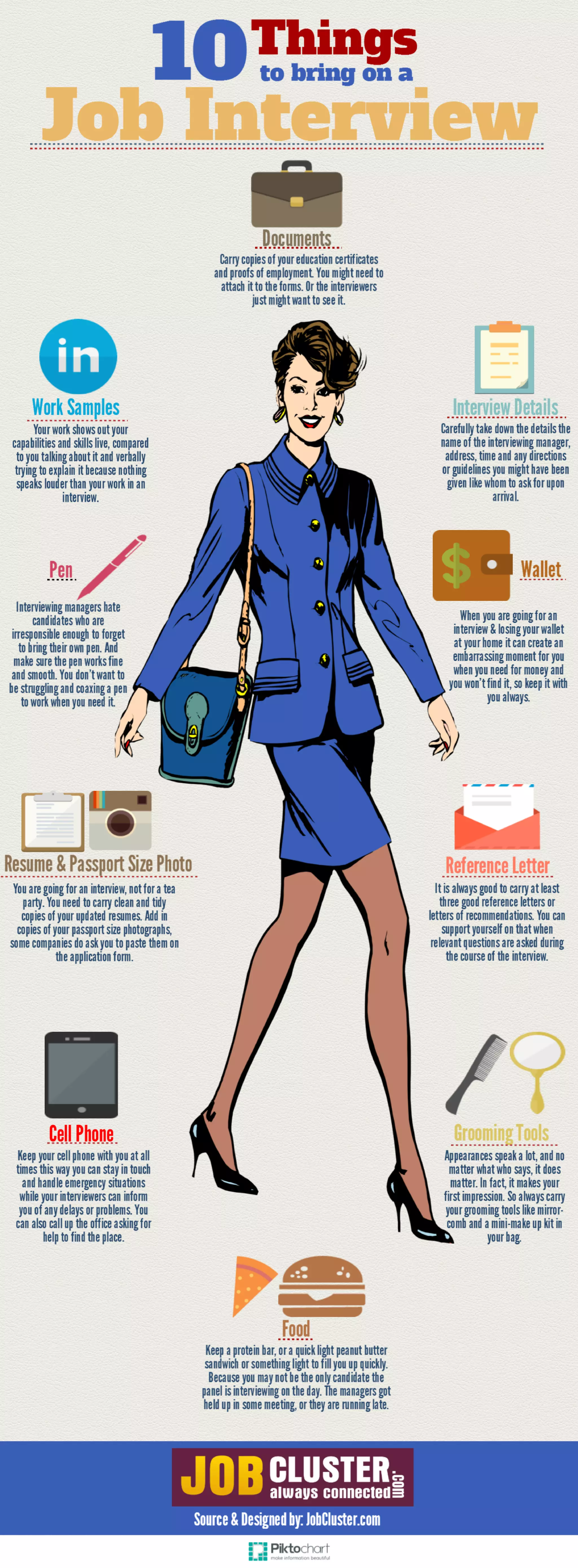 Here is an infographic which describes most important 10 things to bring on a job interview which you should not forget to take with you whenever you are going for a job interview.