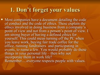 This document outlines 10 things employees should avoid doing in the office. These include [1] failing to follow your own values at work, [2] overcommitting to take on too much work, and [3] isolating yourself from coworkers by avoiding social interactions. It also advises against [4] compromising your self-respect to please others, [5] doing personal work during company time, [6] meddling in work that is not yours, [7] lying, [8] engaging in personal relationships at the office, [9] gossiping about coworkers, and [10] stealing company property or information. Following these guidelines can help employees maintain a professional work environment and good reputation