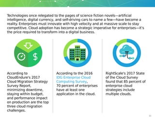 The document discusses strategies for enterprise cloud migrations. It notes that minimizing downtime, staying within budget, and avoiding performance impacts are top challenges. It recommends developing a multi-cloud strategy using approaches like lift-and-shift, re-architecting, and reconsidering applications. Preparing applications by fixing issues, understanding architecture and user needs, and monitoring performance during migration are also emphasized.