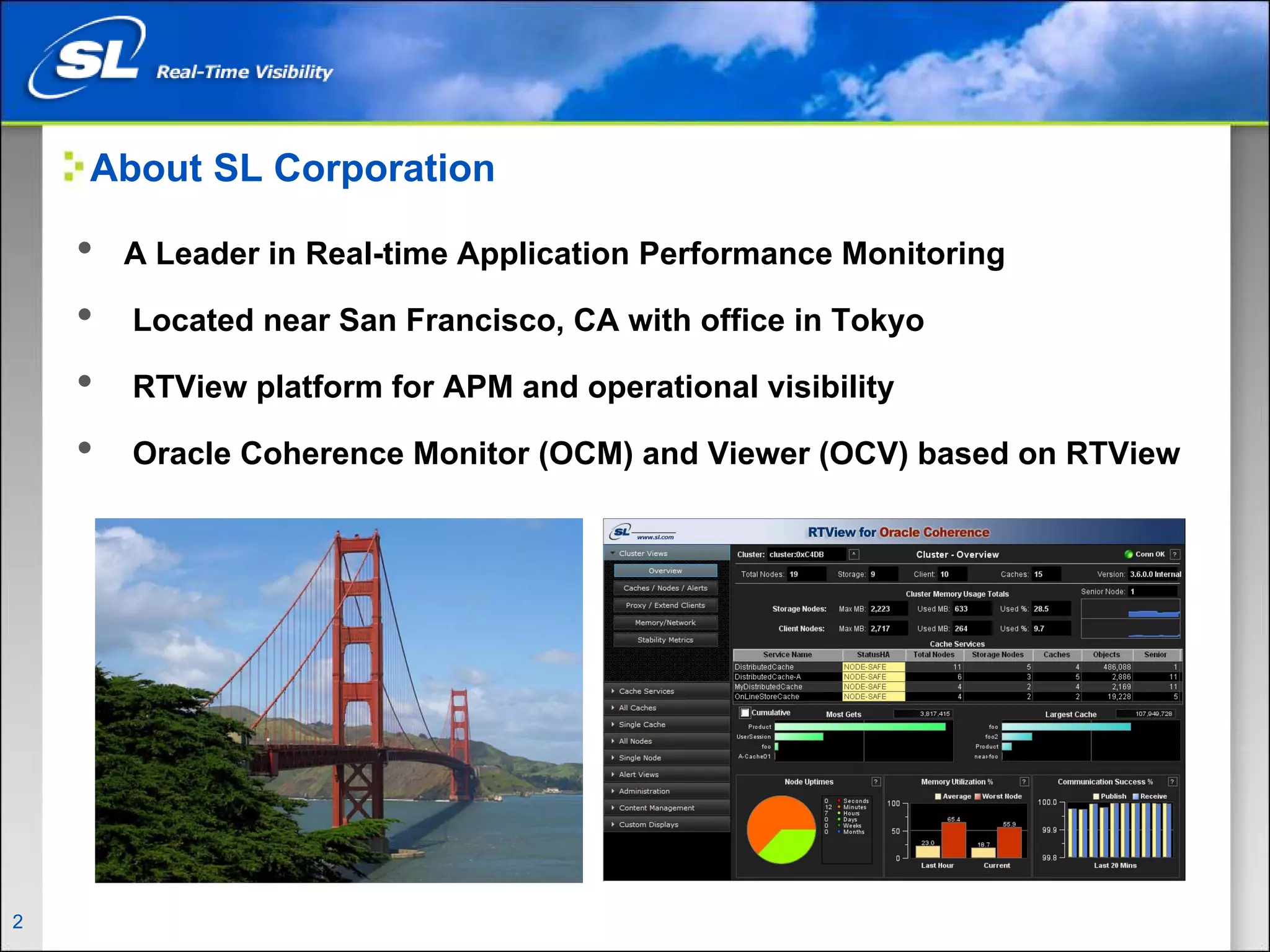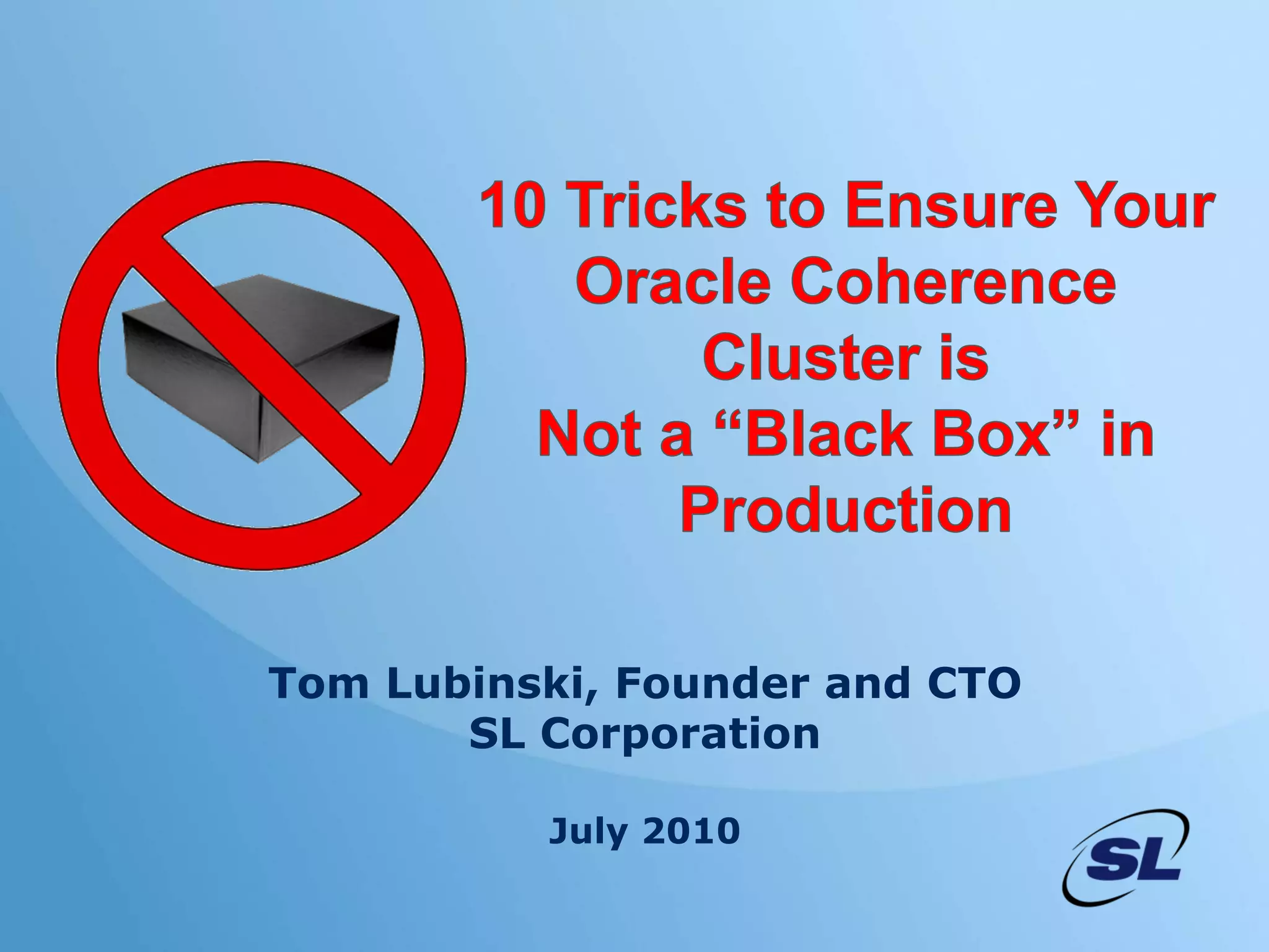 Tom Lubinski is the founder and CTO of SL Corporation, located near San Francisco. SL Corporation produces the RTView platform for application performance monitoring and operational visibility, including the Oracle Coherence Monitor (OCM) and Viewer (OCV). The document discusses why monitoring Coherence clusters is important, what typically happens with Coherence projects, and provides 10 things that can be done to better monitor and manage Coherence clusters, such as understanding network metrics, configuring services for monitoring, and instrumenting applications.
