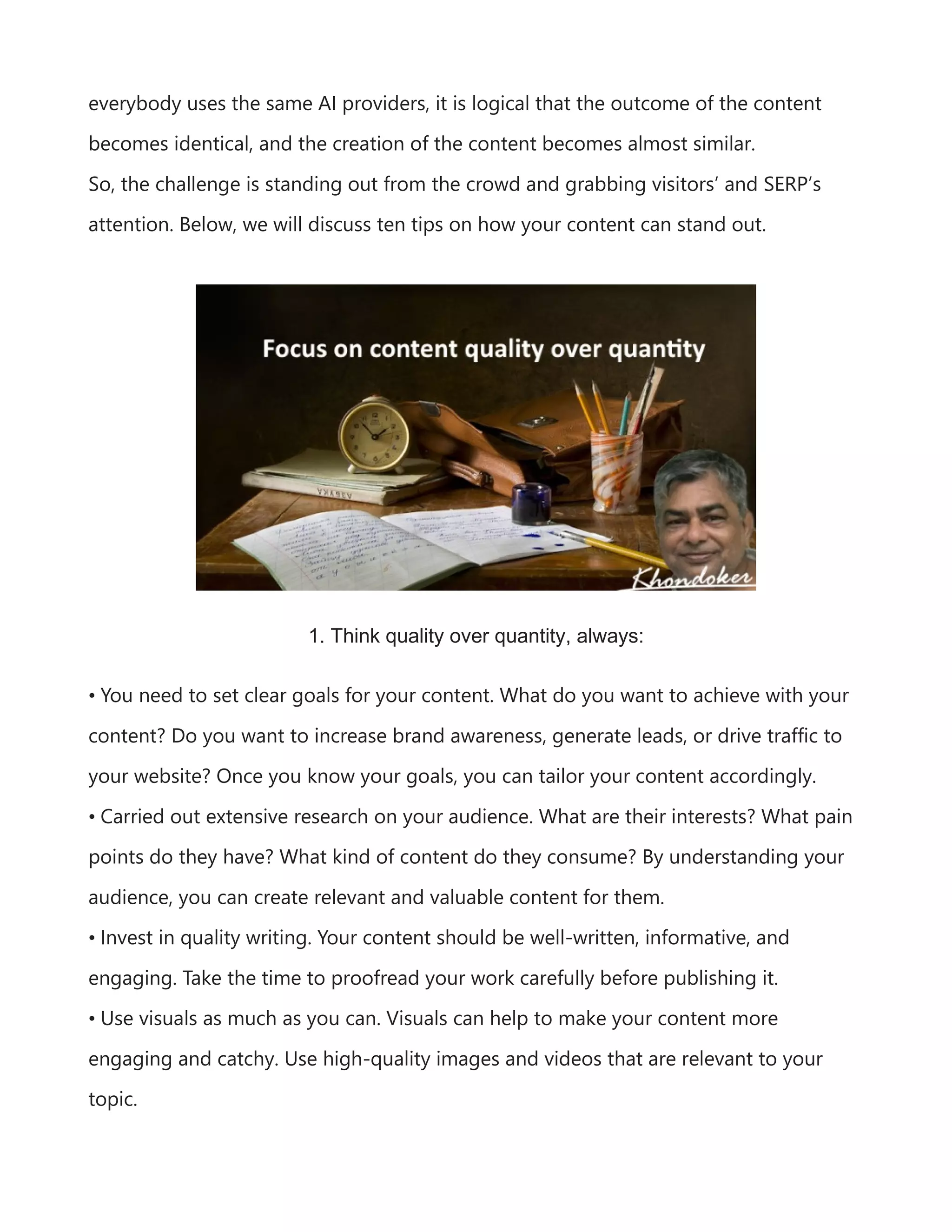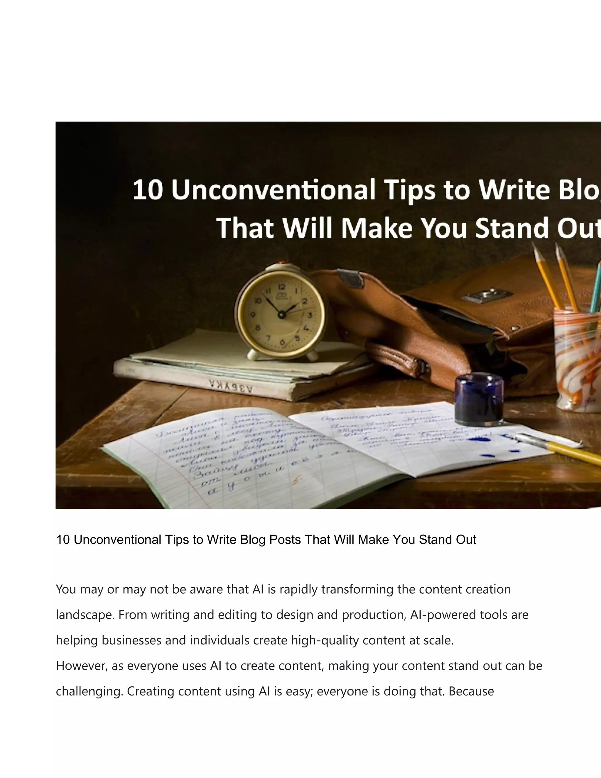 The document outlines ten unconventional tips for writing blog posts that stand out in an evolving landscape influenced by AI. Key recommendations include prioritizing quality over quantity, using effective visuals, and integrating personal experiences to enhance relatability and engagement. Additionally, it emphasizes the importance of promoting content strategically and utilizing AI tools to streamline content creation while ensuring originality and creativity.