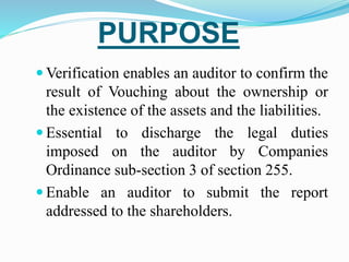 The document discusses techniques for verifying assets and liabilities during an audit. It outlines six key techniques: 1) verifying physical existence, 2) assessing correct valuation, 3) confirming ownership, 4) ensuring proper disclosure, 5) identifying any charges on assets, and 6) checking for proper authorization of transactions. Specific procedures are described for different asset types, including obtaining certificates from management and third parties. The auditor must also consider events after the balance sheet date and obtain a management representation letter.