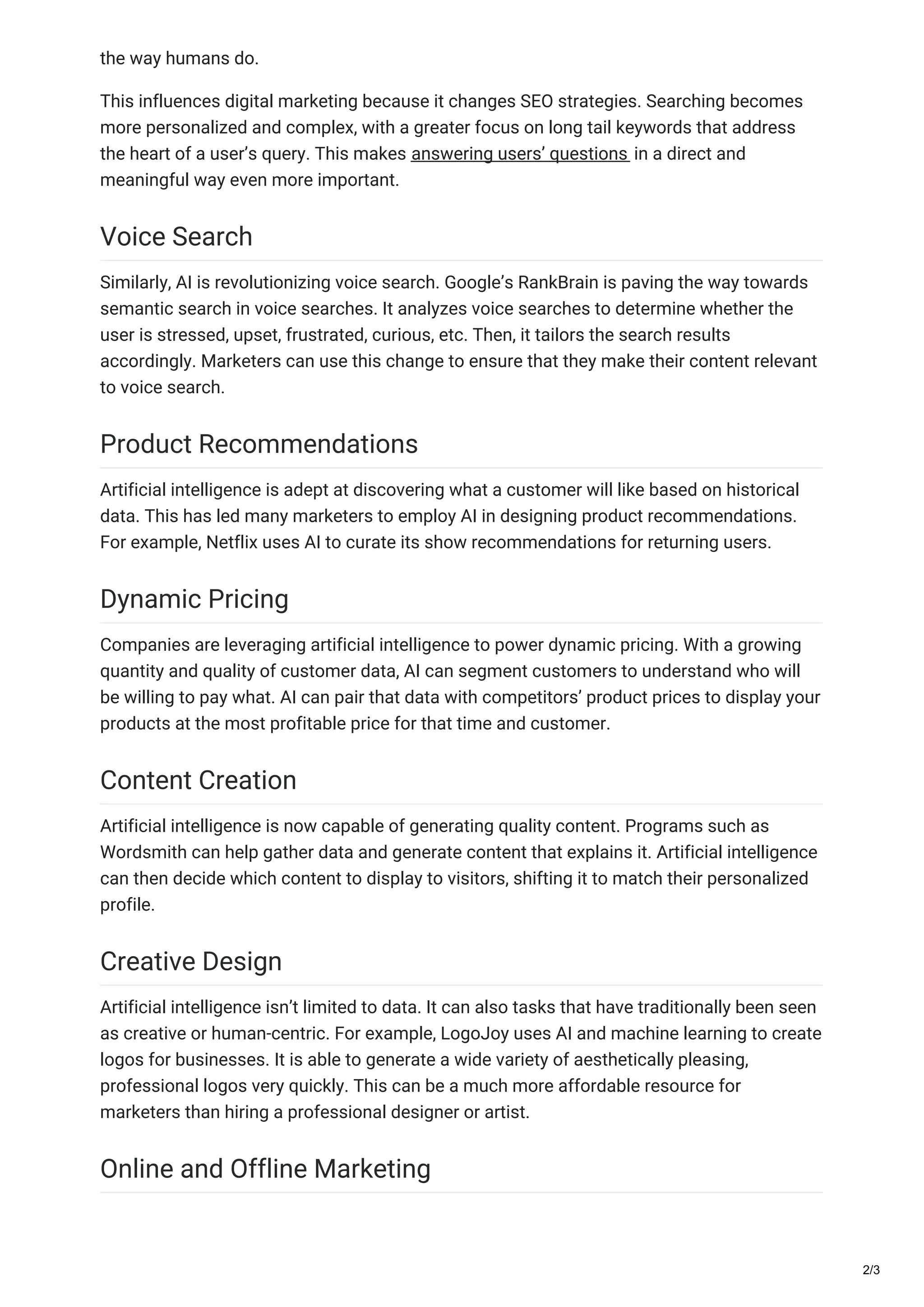 The document outlines ten ways artificial intelligence (AI) is transforming digital marketing, including customer identification, semantic search, voice search, and product recommendations. AI also enhances dynamic pricing, content creation, creative design, and customer service through advanced chatbots. As AI continues to evolve, marketers must adapt to leverage its capabilities for improved performance and customer engagement.