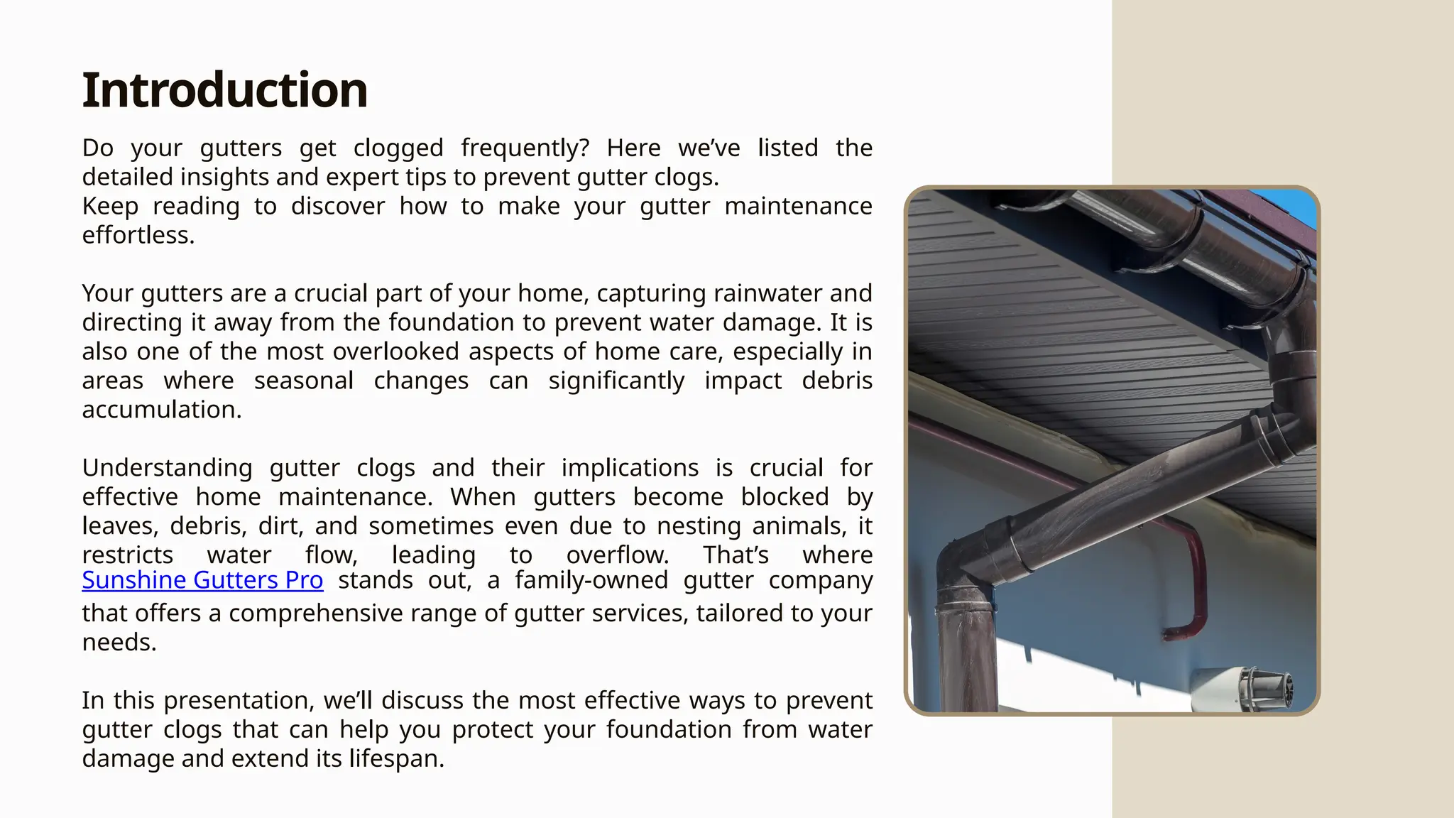 Check out this presentation to learn 10 smart ways to stop gutter clogs before they begin, protecting your home from water damage and reducing maintenance all year.