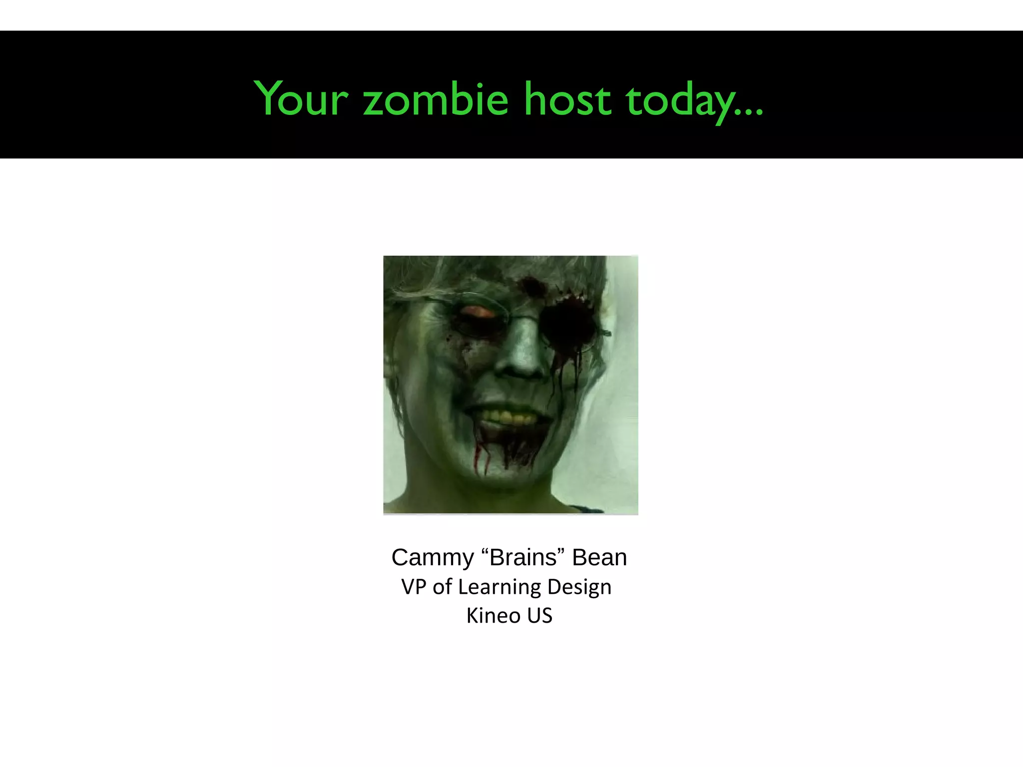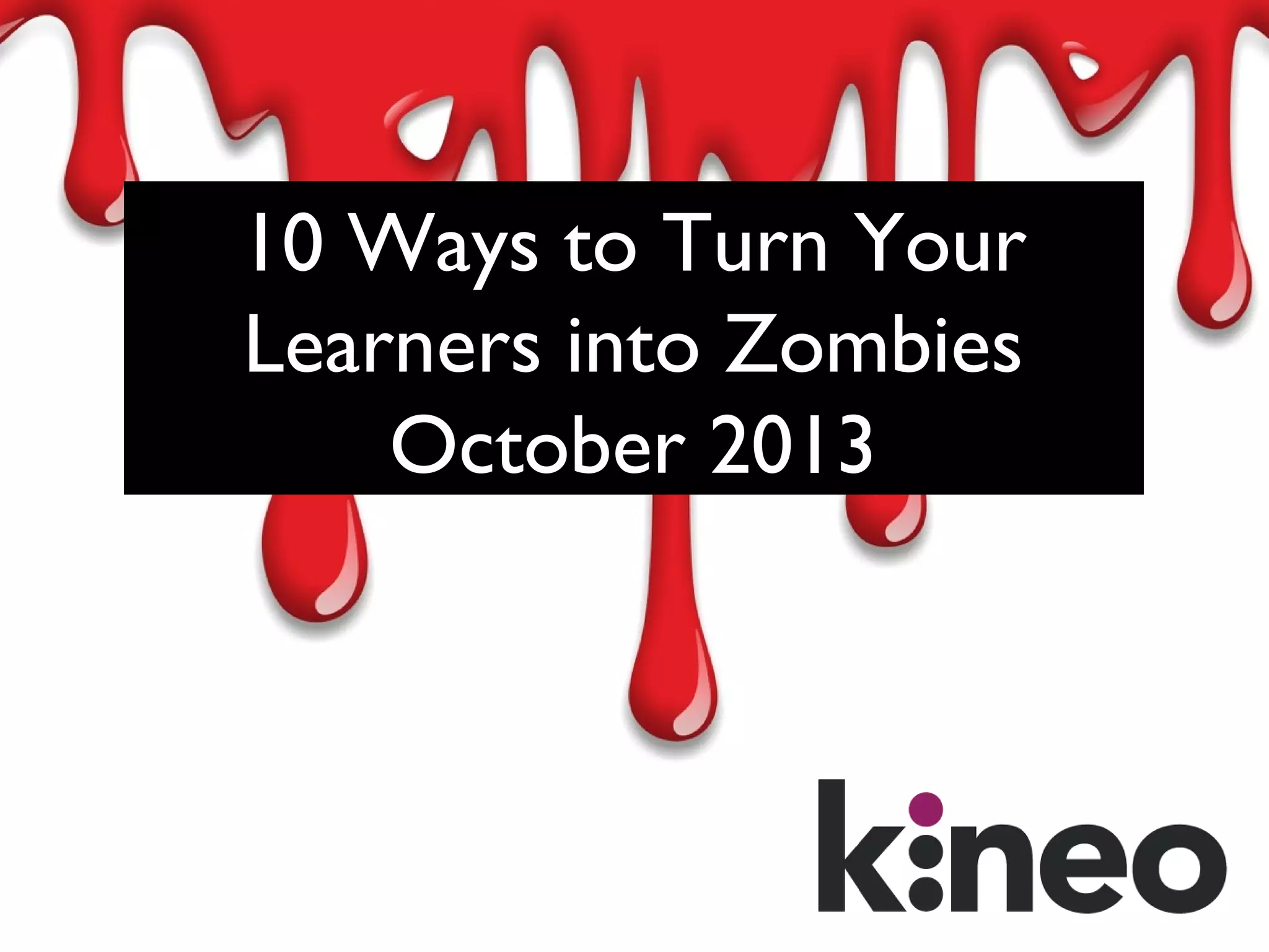 The document outlines 10 ways to turn learners into zombies by using ineffective instructional design techniques. It recommends acting like a "zombie hunter" instead by 1) making the learning management system engaging; 2) grabbing learner attention with stories rather than objectives; 3) using interactive video rather than information dumps; 4) speaking to learners like humans; 5) giving relevant activities and opportunities for reflection; 6) using on-brand visuals rather than stock photos; 7) providing choices and opportunities to explore; 8) giving calls to action and hope for the future; 9) enabling collaboration; and 10) creating a learning campaign rather than single events.