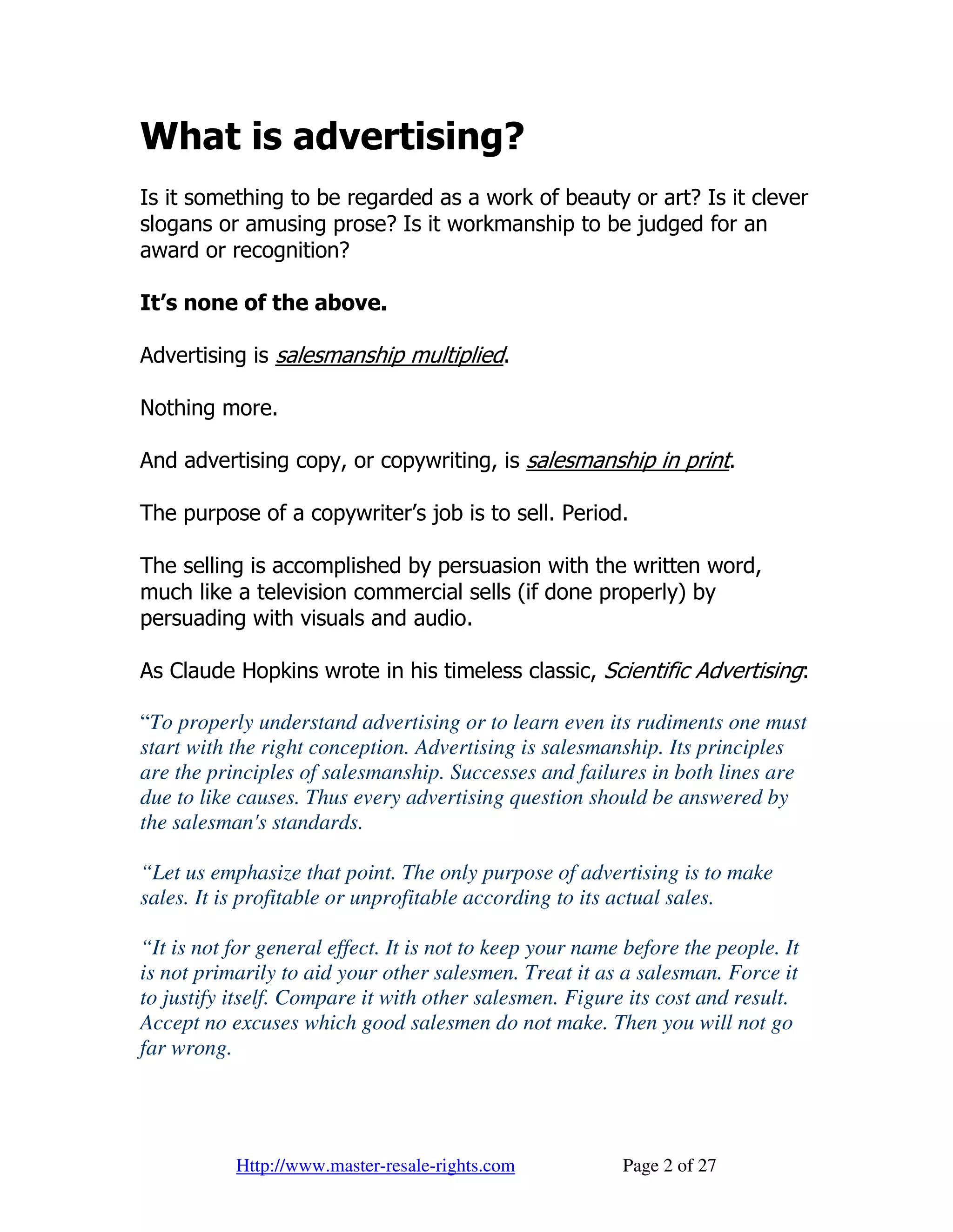 This document provides 10 tips for writing more effective advertising copy. It begins by establishing that the purpose of advertising is to make sales, not be artistic or clever. It then discusses focusing copy on the customer's benefits rather than the product's features. The document emphasizes learning what emotional hot buttons a target customer has in order to craft persuasive copy that pushes those buttons. It stresses the importance of testing ads to determine what copy performs best.