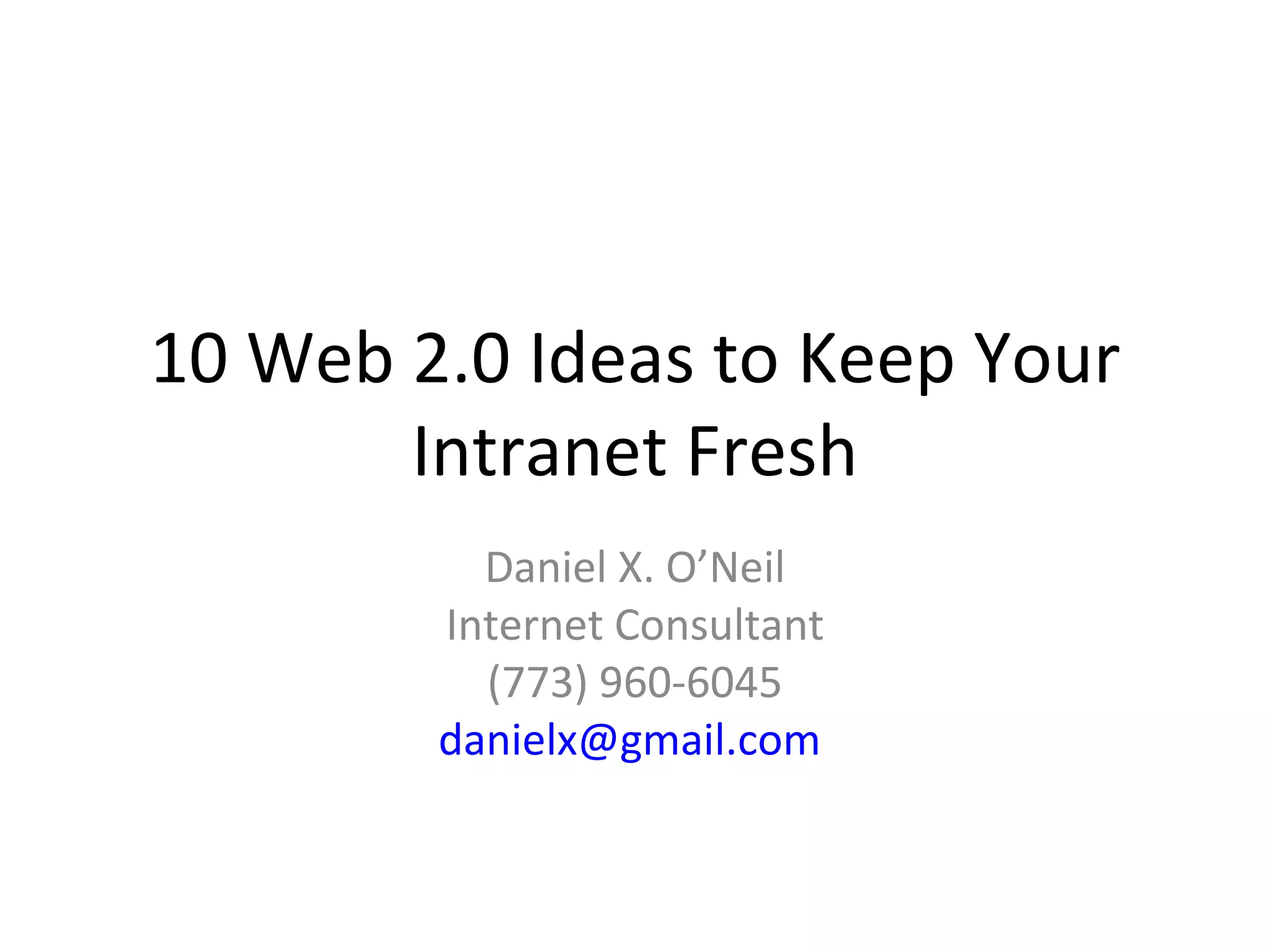 The document provides 10 ideas for using Web 2.0 tools to keep company intranets fresh, including using Google Reader to subscribe to industry news and feeds, Flickr to share company photos, Google Video to stream videos, Google Apps for a turnkey intranet, Google Gadgets to add widgets, Live.com for custom maps, WordPress for blogging and content management, social networking, and Zocalo for internal prediction markets. It describes setting up each tool and its benefits for internal company use.