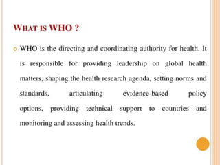 The document discusses international guidelines for herbal drugs. The International Council for Harmonization (ICH) brings together regulatory bodies and the pharmaceutical industry to achieve greater harmonization of standards for safe, effective, and high-quality medicines worldwide. While ICH does not have separate guidelines for herbal drugs, development, testing, and clinical trials of herbal medicines follow ICH standards. The World Health Organization also provides information and guidelines regarding traditional and herbal medicines, as over 60% of the world's population uses some form of traditional medicine.