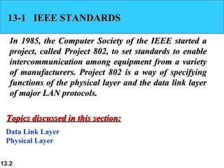 This document discusses the evolution of Ethernet standards over multiple generations from the original Ethernet created in 1976 to modern Gigabit Ethernet. It describes the work of IEEE Project 802 to set standards enabling interoperability among networking equipment from different manufacturers. Key standards discussed include the original 10 Mbps Standard Ethernet, as well as faster variants like Fast Ethernet operating at 100 Mbps, Gigabit Ethernet at 1 Gbps, and Ten-Gigabit Ethernet. The physical layer and data link layer are examined along with changes to Ethernet like bridging, switching, and full-duplex operation that increased speed and supported higher data rates over time.
