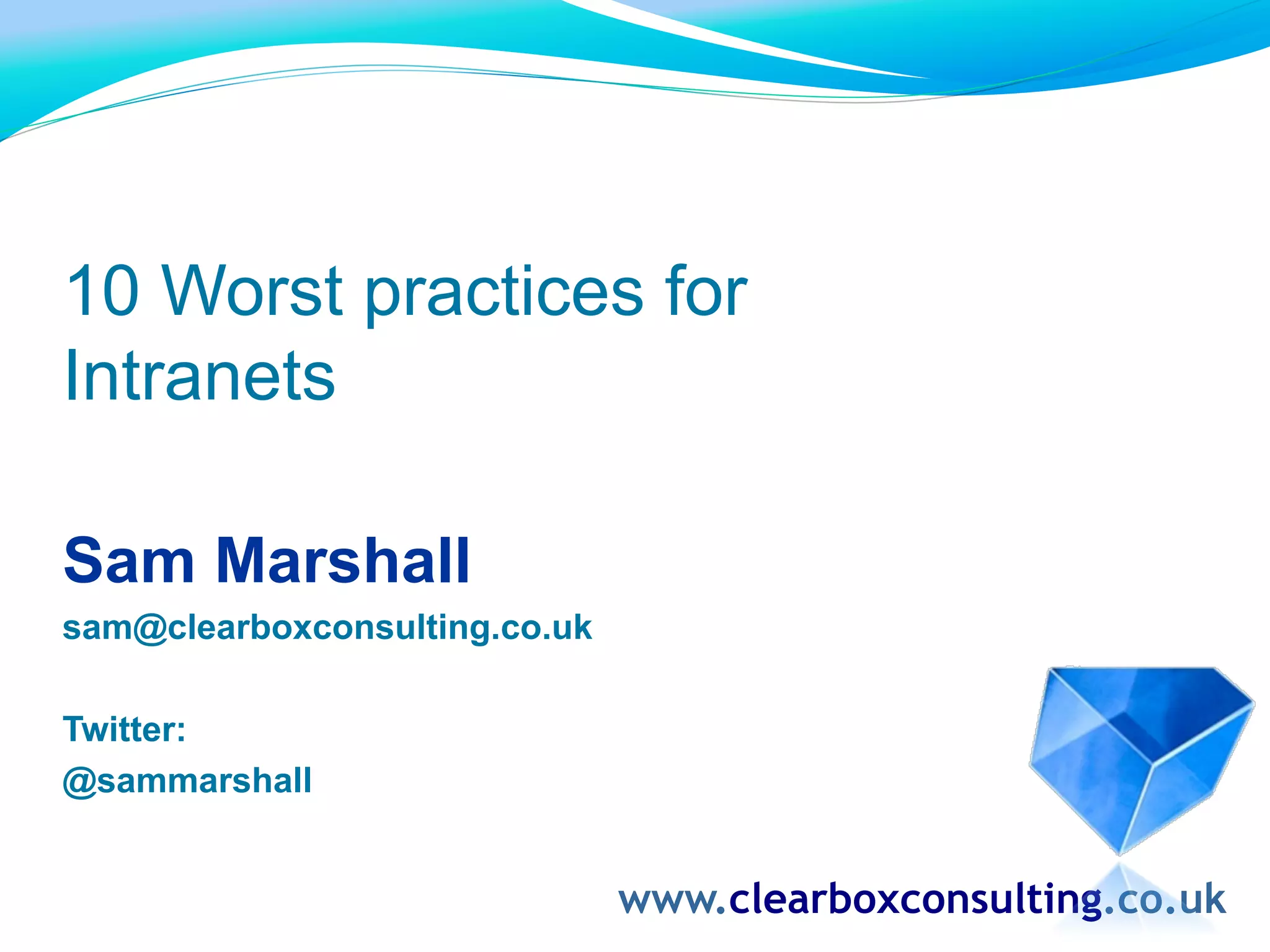 The document outlines the 10 worst practices for intranets, emphasizing errors such as focusing solely on head office perspectives, making information unreliable, and excluding diverse employee needs. It discusses the importance of user engagement, effective communication strategies, and structured content to enhance the intranet experience. The author encourages learning from the mistakes of others rather than from personal experience to create more effective intranet systems.