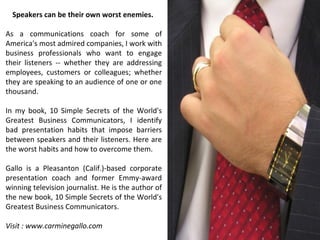 The document discusses 10 bad presentation habits and how to overcome them. Some of the worst habits include reading from notes, avoiding eye contact with the audience, dressing inappropriately, fidgeting or swaying while speaking, failing to rehearse, standing stiffly, reciting bullet points directly from slides, speaking for too long, failing to excite the audience early on, and not ending with an inspiring conclusion. The document provides tips on how to avoid each habit, such as thoroughly learning the material, maintaining eye contact 90% of the time, dressing appropriately, controlling mannerisms, extensive rehearsal, being animated, speaking to complement slides not read them, being concise, grabbing attention at the start, and ending powerfully.