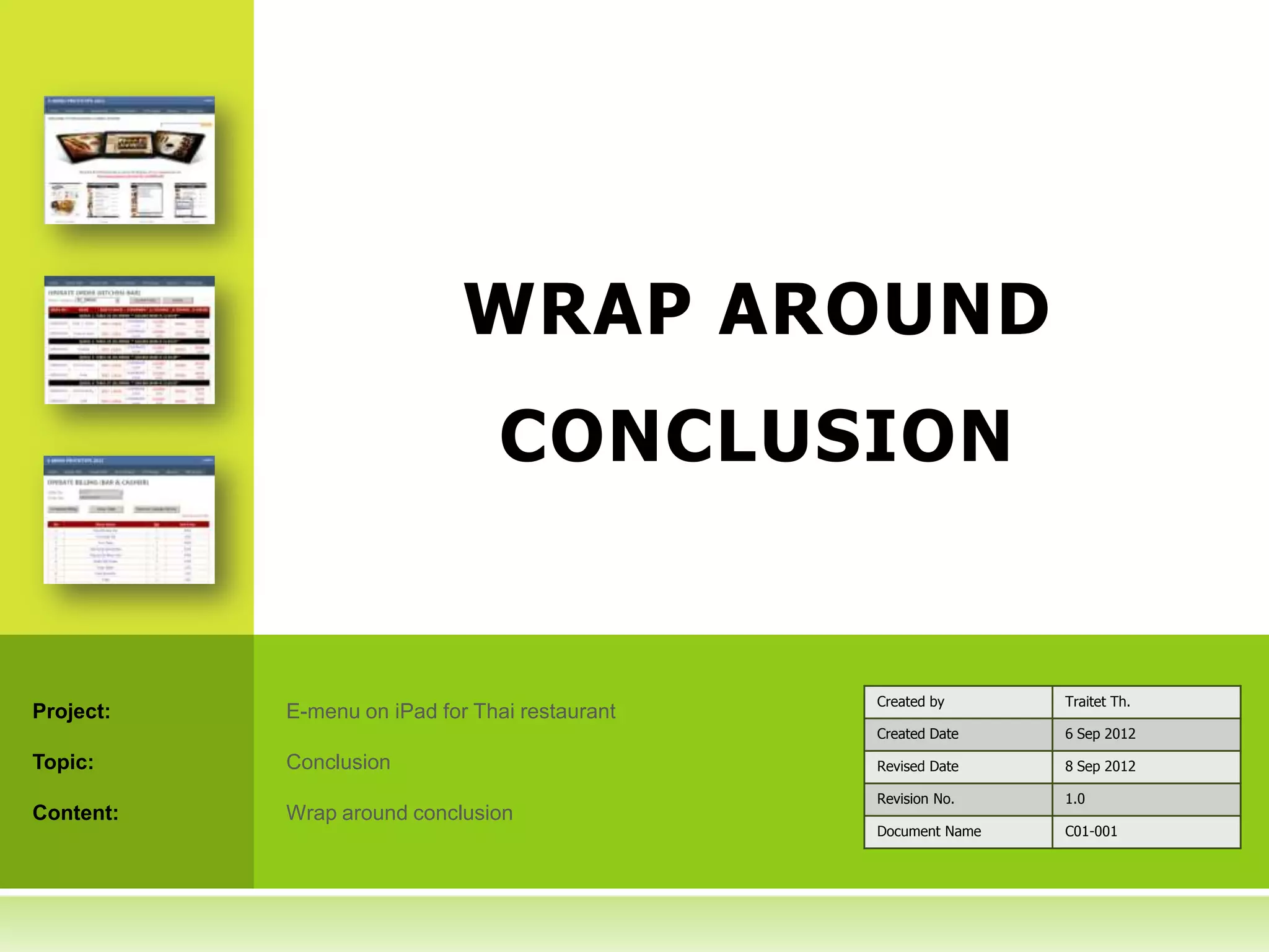 This document provides a wrap around conclusion for a project developing an e-menu application for a Thai restaurant. It summarizes the key stages of research including reviewing relevant knowledge areas, designing a research framework and action plan, developing prototypes of the e-menu app, gathering user feedback, and identifying limitations and recommendations. The research contributed system design documents, e-menu prototypes, analysis of user perceptions, and recommendations to help produce a functional e-menu system meeting business needs.