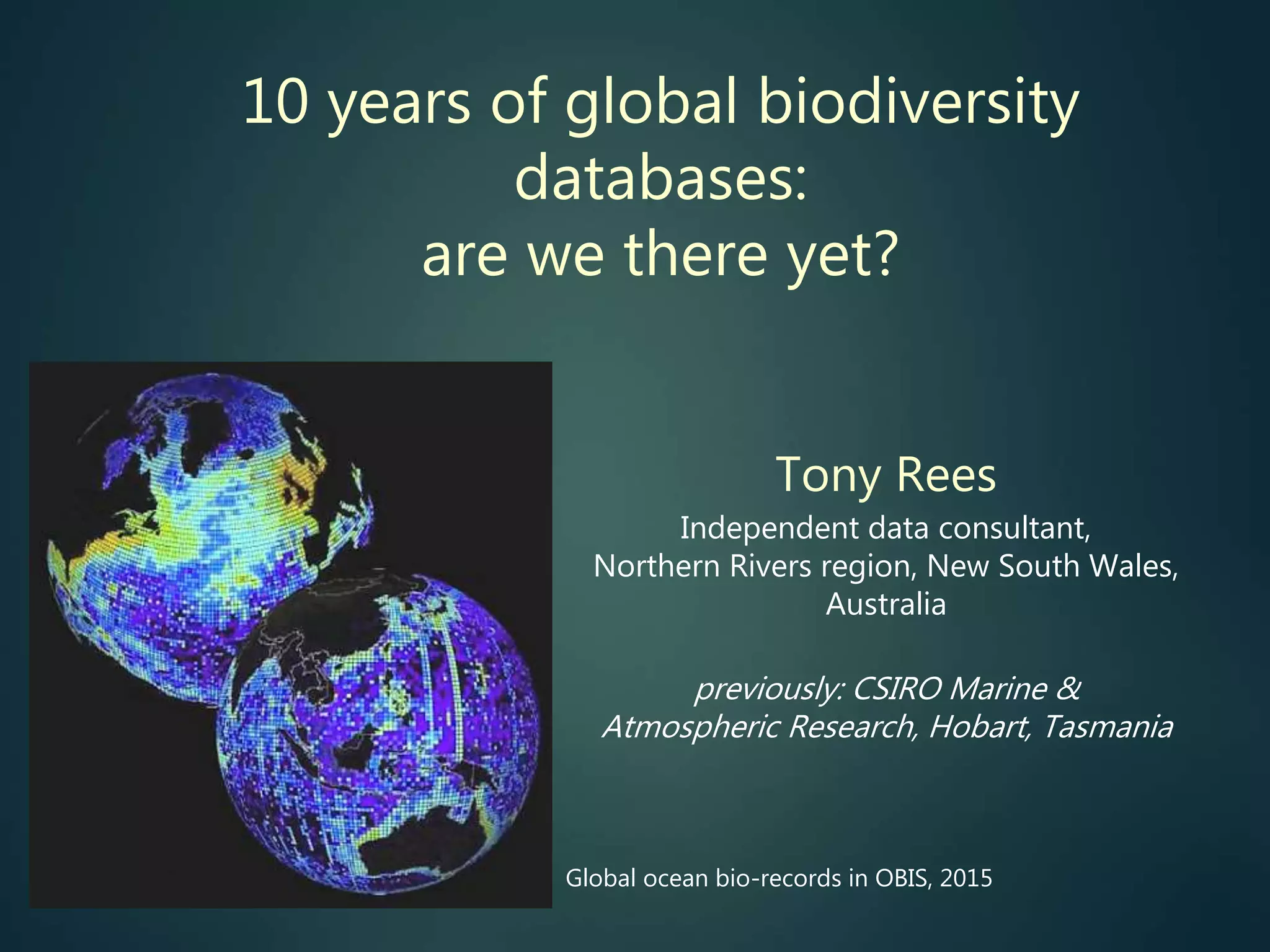 The document discusses the progress made over the past 10 years towards achieving a vision of having comprehensive biodiversity information accessible online. It examines several key components of this vision including developing a global taxon inventory, linking names to primary literature, assembling georeferenced species records, and creating machine-readable taxon trait data. For each component, it provides details on the scope of the task, current resources addressing it, and how complete the work is so far, noting many challenges that still remain.