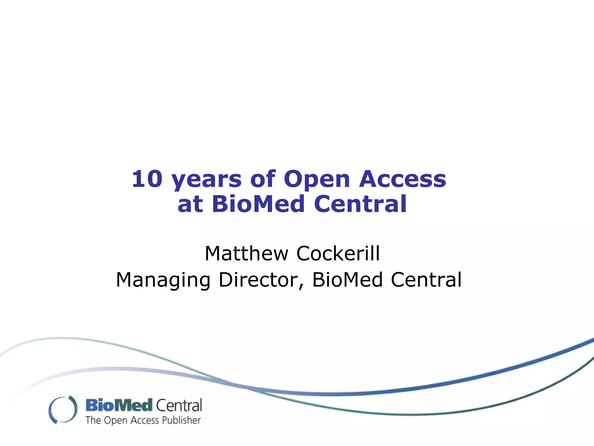 BioMed Central is the largest publisher of peer-reviewed open access journals, launching its first journal in 2000. It now publishes 199 open access journals and over 50,000 peer-reviewed articles. BioMed Central uses an open access business model where authors pay article processing charges to cover the costs of publication, while ensuring all research is freely accessible. The document discusses BioMed Central's growth over 10 years and acquisition by Springer, ensuring its commitment to open access will continue.