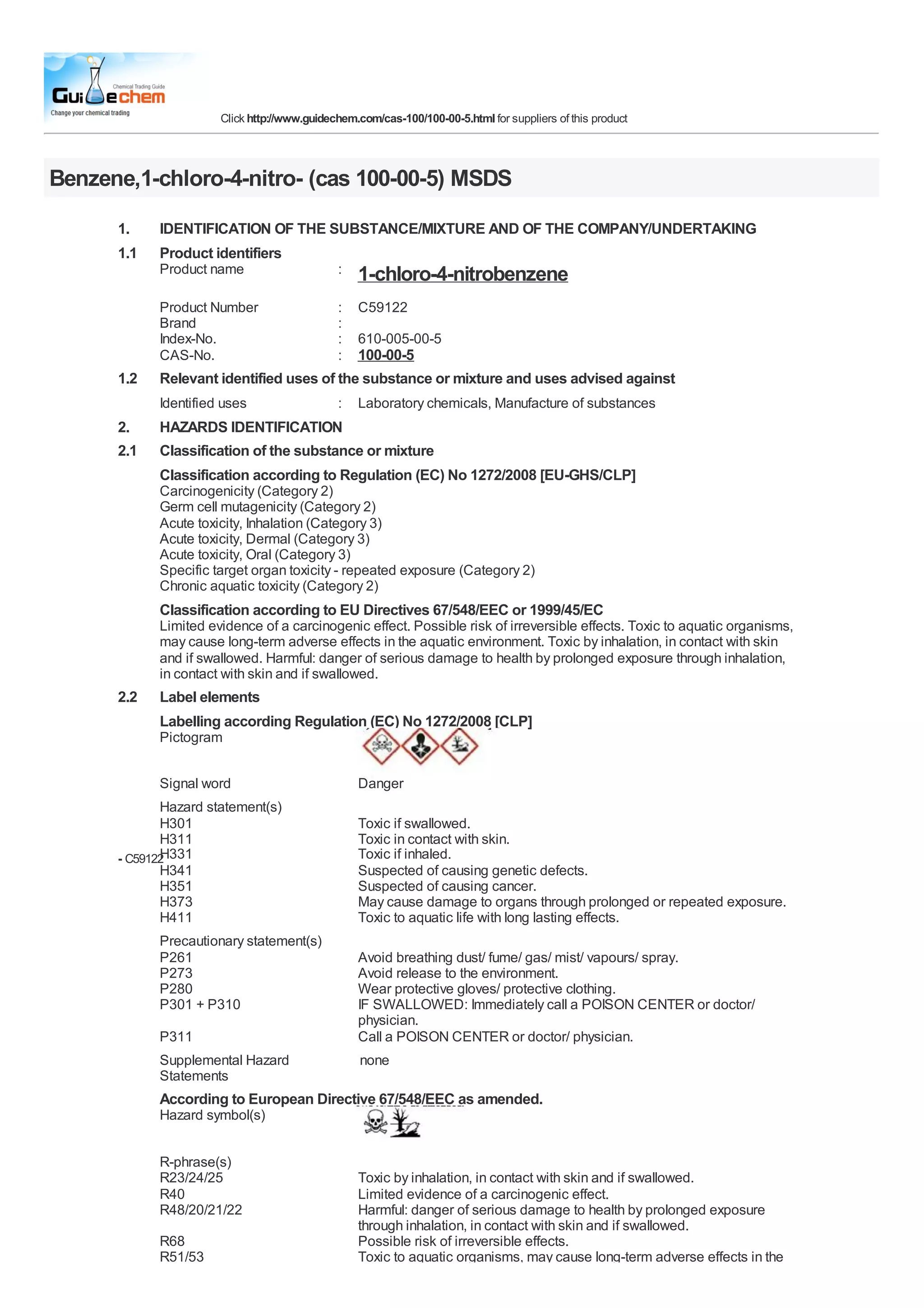 This document provides information on the chemical 1-chloro-4-nitrobenzene (CAS 100-00-5), including its identification, hazards, composition, safe handling and storage, exposure controls, toxicological properties, and regulatory information. Key points: