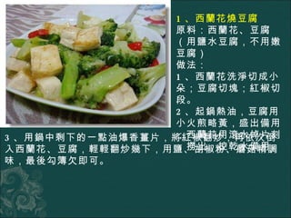 本文档列举了多种素食菜肴的做法,包括西兰花烧豆腐、蕃茄炒冻豆腐等共100种不同的菜品。每道菜提供了所需原料和具体的烹饪步骤,旨在为读者提供简单易行的素食食谱。整体内容旨在丰富植物性饮食的选择。