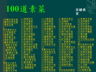 该文档列出了100种菜肴的名称及其原料和烹饪方法,涵盖了各种豆腐、蔬菜及其搭配。每道菜都提供了详细的材料准备和步骤,适合喜欢健康素食的人。文档呈现了丰富的烹饪选择,便于读者参考和制作。