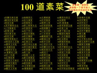 此文档包含 100 道素菜的食谱,包括原料和制作方法。每道菜品都有详细的步骤指导,适合各类素食爱好者。文档展示了多样的素食组合,突显了健康饮食的选择。