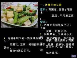 该文档列出了一百道素菜的菜谱,包括不同的食材与制作方法。每道菜的原料、步骤和一些烹饪窍门都有详细说明,适合素食者和喜欢尝试新菜式的人。菜谱涵盖了从清炒到炸制的多种烹饪方式,展示了丰富的素食烹饪风格。