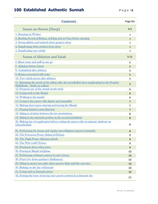 This document outlines 100 established authentic Sunnah practices related to various aspects of Islamic worship and daily life. It is divided into sections covering Sunnah related to sleep, ablution and prayer, fasting, travel, clothing/eating, remembrance/supplication, and other topics. Each Sunnah is briefly described with references to relevant scriptural sources and prophetic traditions. The document serves as a comprehensive guide to proper Islamic conduct according to the example of the Prophet Muhammad.