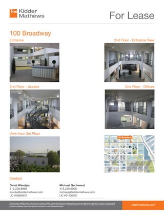 The document is a listing for 100 Broadway in San Francisco, CA advertising office space for lease. It includes the following key details:
