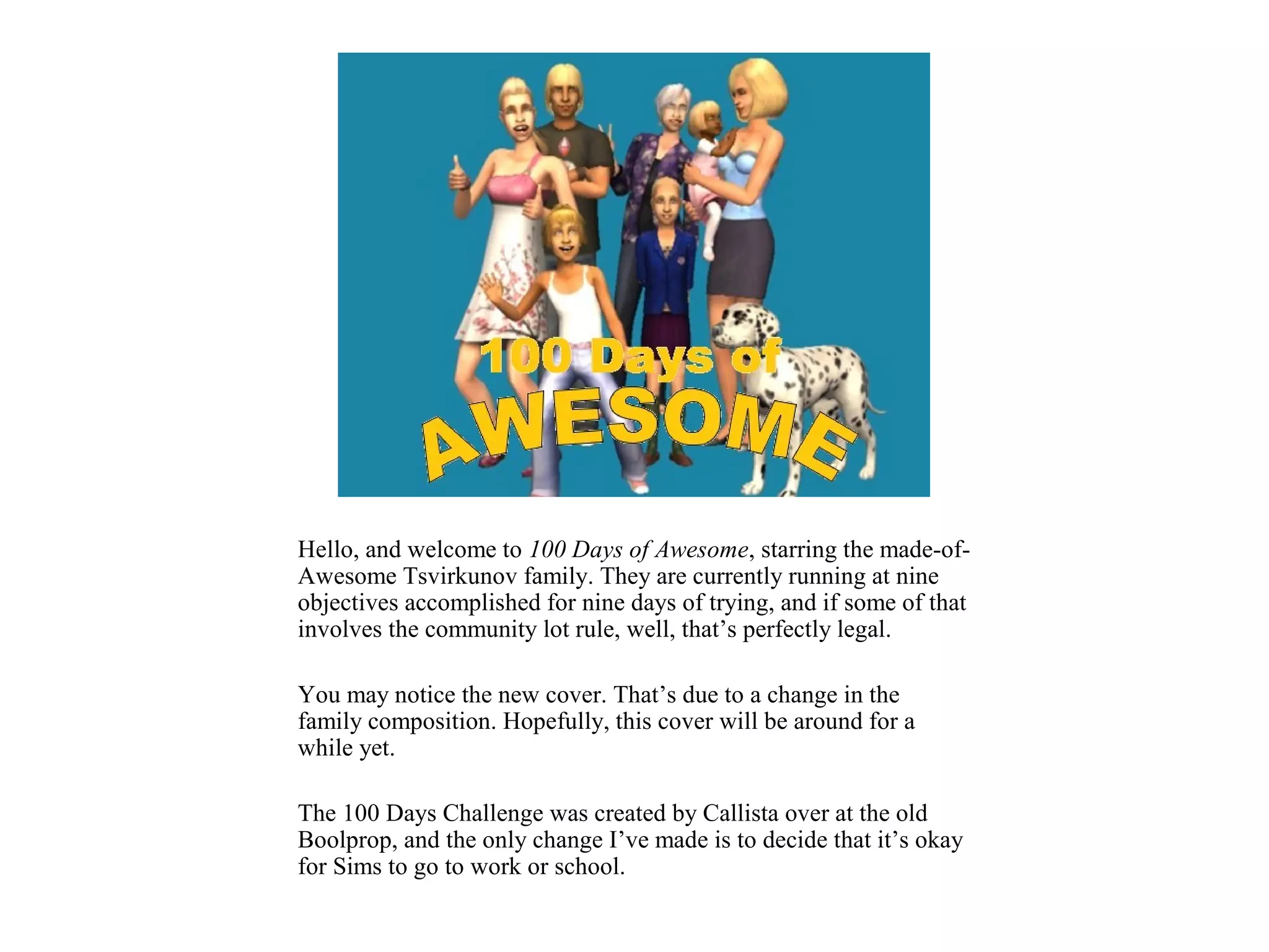 The document provides an overview of the daily activities and tasks of the Tsvirkunov family as part of their 100 Days of Awesome challenge. On this day, Abbey takes over caring for Georgiana in the morning so Anastasia can rest. Anastasia's task is to have the Social Bunny visit, which causes some debate around deadlines. Abbey ends up befriending a service Sim at a nightclub to complete her alternative task. Rebecca's task of singing goes smoothly. Preparations are made for Allyn and Georgiana's joint birthday party that afternoon, including cake selection and getting new outfits.