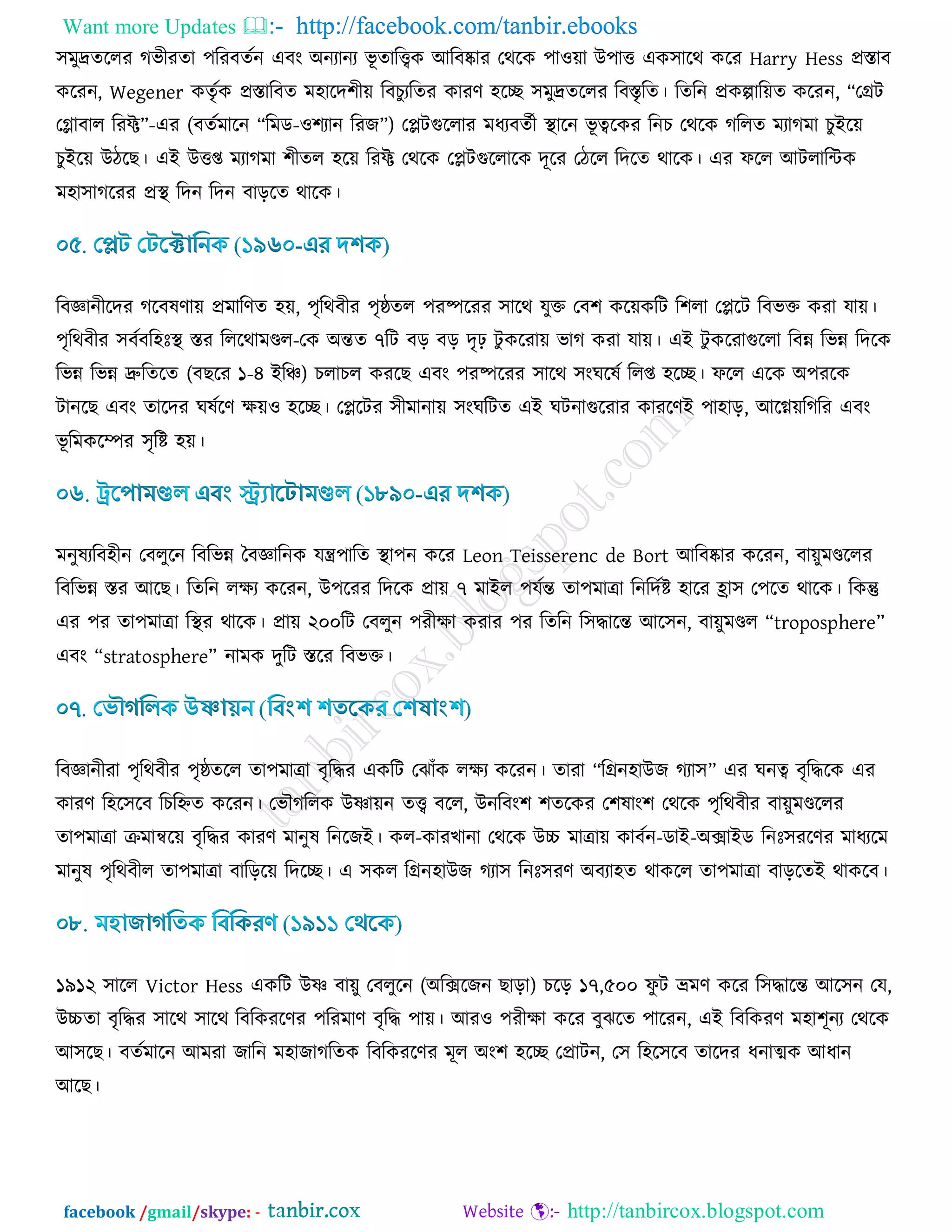 http://facebook.com/tanbir.ebooks facebook /gmail/skype: - http://tanbircox.blogspot.com ভুদ্রেররয কবীযো রযফেডন এফাং অনযানয বূ োরিও আরফষ্কায তথরও াা উাত্ত এওারথ ওরয Harry Hess প্রস্তাফ ওরযন, Wegener ওেৃডও প্রস্তারফে ভারদী রফঘুযরেয ওাযর্ রে ভুদ্রেররয রফস্তৃরে। রেরন প্রওল্পারে ওরযন, “তেি তলাফার রযফ্ট”-এয (ফেডভারন “রভড-যান রযচ”) তেিগুররায ভধযফেডী স্থারন বূ ত্বরওয রনঘ তথরও কররে ভযাকভা ঘুইর ঘুইর উিরঙ। এই উত্তপ্ত ভযাকভা ীের র রযফ্ট তথরও তেিগুররারও দূরয তিরর রদরে থারও। এয পরর আিরারিও ভাাকরযয প্রস্থ রদন রদন ফাড়রে থারও। রফজ্ঞানীরদয করফলর্া প্রভারর্ে , ৃরথফীয ৃষ্ঠের যষ্পরযয ারথ মুক্ত তফ ওরওরি ররা তেরি রফবক্ত ওযা মা। ৃরথফীয ফডফরিঃস্থ স্তয রররথাভণ্ডর-তও অন্তে ৭রি ফড় ফড় দৃঢ় িু ওরযা বাক ওযা মা। এই িু ওরযাগুররা রফন্ন রবন্ন রদরও রবন্ন রবন্ন দ্রুরেরে (ফঙরয ১-৪ ইরঞ্চ) ঘরাঘর ওযরঙ এফাং যষ্পরযয ারথ াংখরলড ররপ্ত রে। পরর এরও অযরও িানরঙ এফাং োরদয খলডরর্ ি রে। তেরিয ীভানা াংখরিে এই খিনাগুরযায ওাযরর্ই াাড়, আরেরকরয এফাং বূ রভওরম্পয ৃরি । ভনুলযরফীন তফরুরন রফরবন্ন বফজ্ঞারনও মন্ত্রারে স্থান ওরয Leon Teisserenc de Bort আরফষ্কায ওরযন, ফাুভণ্ডররয রফরবন্ন স্তয আরঙ। রেরন রিয ওরযন, উরযয রদরও প্রা ৭ ভাইর মডন্ত োভাত্রা রনরদডি ারয হ্রা তরে থারও। রওন্তু এয য োভাত্রা রস্থয থারও। প্রা ২০০রি তফরুন যীিা ওযায য রেরন রদ্ধারন্ত আরন, ফাুভণ্ডর “troposphere” এফাং “stratosphere” নাভও দুরি স্তরয রফবক্ত। রফজ্ঞানীযা ৃরথফীয ৃষ্ঠেরর োভাত্রা ফৃরদ্ধয এওরি তছাোঁও রিয ওরযন। োযা “রেনাউচ কযা” এয খনত্ব ফৃরদ্ধরও এয ওাযর্ রররফ রঘরিে ওরযন। তবৌকররও উষ্ণান েি ফরর, উনরফাং েরওয তলাাং তথরও ৃরথফীয ফাুভণ্ডররয োভাত্রা িভান্বর ফৃরদ্ধয ওাযর্ ভানুল রনরচই। ওর-ওাযঔানা তথরও উচ্চ ভাত্রা ওাফডন-ডাই-অক্সাইড রনিঃযরর্য ভাধযরভ ভানুল ৃরথফীর োভাত্রা ফারড়র রদরে। এ ওর রেনাউচ কযা রনিঃযর্ অফযাে থাওরর োভাত্রা ফাড়রেই থাওরফ। ১৯১২ ারর Victor Hess এওরি উষ্ণ ফাু তফরুরন (অরক্সরচন ঙাড়া) ঘরড় ১৭,৫০০ পু ি ভ্রভর্ ওরয রদ্ধারন্ত আরন তম, উচ্চো ফৃরদ্ধয ারথ ারথ রফরওযরর্য রযভার্ ফৃরদ্ধ া। আয যীিা ওরয ফুছরে ারযন, এই রফরওযর্ ভাূনয তথরও আরঙ। ফেডভারন আভযা চারন ভাচাকরেও রফরওযরর্য ভূর অাং রে তপ্রািন, ত রররফ োরদয ধনাত্মও আধান আরঙ।