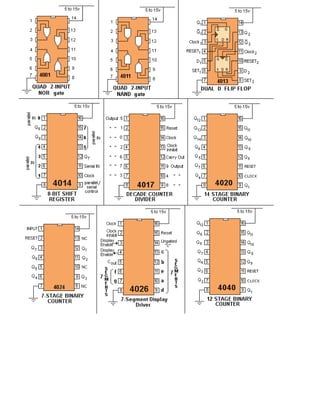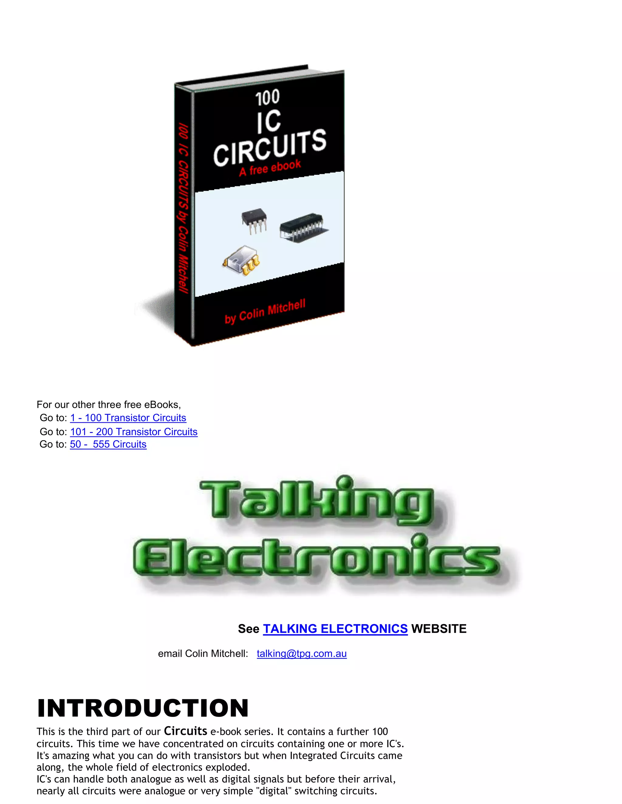 This document provides an introduction to several integrated circuit (IC) circuits that can be used in electronics projects. It discusses the advantages of digital circuits over analog, and how ICs like the 555 timer chip have allowed for more complex circuits. The document then lists 100 IC-based circuits that are included in the ebook, such as a knight rider light scanner, police lights, and a metal detector. It concludes by explaining common transistors and the 555 timer chip in more detail.