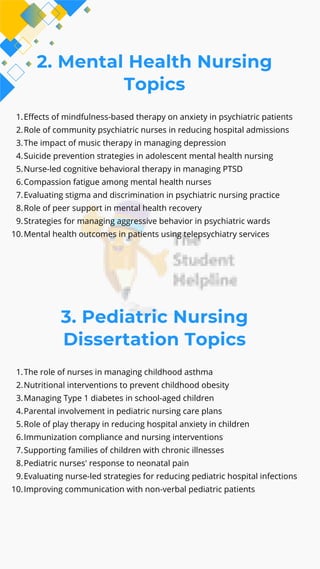 The list includes dissertation topics related to evidence-based practice, patient care innovations, healthcare technology, public health outreach, and nursing education. It also addresses modern trends such as telehealth, AI in nursing, pandemic preparedness, and mental health advocacy. Each topic is designed to be researchable and adaptable to different academic levels—be it undergraduate, master's, or doctoral programs.