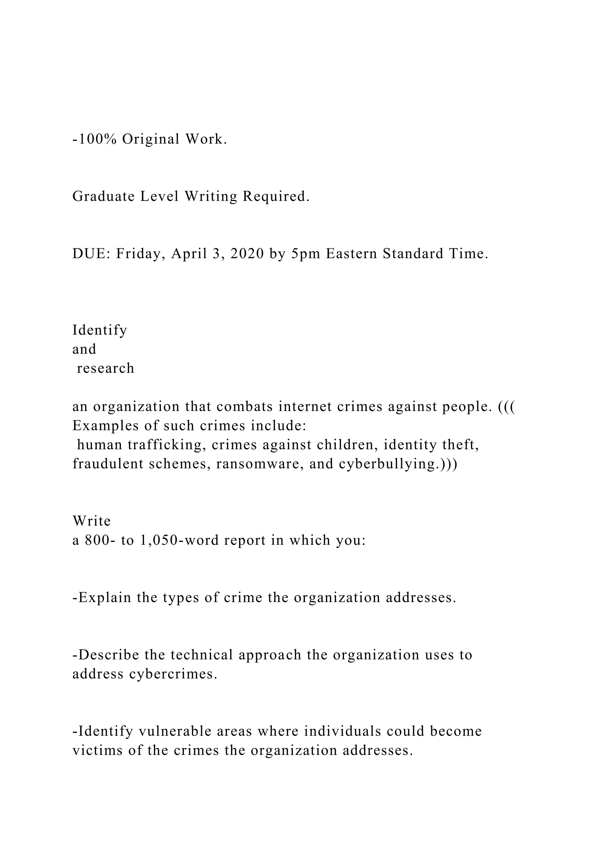 The document outlines an assignment requiring a graduate-level report on an organization that combats internet crimes such as human trafficking and identity theft. It specifies the need to detail the types of crimes addressed, the organization's technical approach, vulnerable victim areas, and prevention methods, all formatted in APA style and supported by at least four scholarly references. The report is due by April 3, 2020, at 5 PM EST.