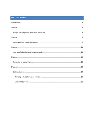 This document provides a comprehensive guide to weight loss through practical tips, focusing on hydration, eating habits, and exercise. It emphasizes the importance of drinking water, consuming fruits and vegetables, and maintaining regular meal patterns to facilitate weight management. The document serves as a resource for individuals looking to lose their first ten pounds by making small, sustainable changes to their lifestyle.