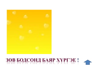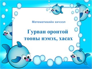 1000 хүртэлх тоо тоолол 1. 2. 3. 4. Дараах тоонуудыг цифрээр бичээрэй. Найман зуун далан ёс Найман зуун ерэн долоо Долоон зуун наян ес Долоон зуун ерэн найм Есөн зуун далан найм Есөн зуун наян долоо 879 897 789 798 978 987 5. 6. 7. 8. 9. 10. 11. 12. 13. 4 2 3 + 2 1 6 = ( 400 + 20 + 3 ) ( 200 + 10 + 6 ) + ( 400 + 200 ) + ( 20 + 10 ) ( 3 + 6 ) = 6 3 9 = + 9 9 3 9 3 6 + 4 2 3 2 1 6 + 4 2 3 2 1 6 + 4 2 3 2 1 6 14. 544+323= хэд гарах вэ? 7 7 6 7 6 8 + 5 4 4 3 2 3 + 5 4 4 3 2 3 + 5 4 4 3 2 3 15. 225+703= хэд гарах вэ? 8 8 2 8 2 9 + 2 2 5 7 0 3 + 2 2 5 7 0 3 + 2 2 5 7 0 3 16. 17. 1000-ын дотор хасах 5 6 8 - 3 2 5 = ( 500 + 60 + 8 ) - ( 300 + 20 + 5 ) = ( 500-300 ) + ( 60-20 ) + ( 8-5 ) = 200 + 40 + 3 = 2 4 3 3 3 4 3 4 2 - 5 6 8 3 2 5 - 5 6 8 3 2 5 - 5 6 8 3 2 5 18. 648-432= хэд гарах вэ? 6 6 1 6 1 2 - 6 4 8 4 3 2 - 6 4 8 4 3 2 - 6 4 8 4 3 2 19. 835-723= хэд гарах вэ? 2 2 1 2 1 1 - 835 723 - 835 723 - 835 723 20. Ажил хийгээд арван хуруу ядраа байлгүй Тоогоо бодсоор толгой хүзүү чилээ байлгүй Амар амар гараа амраа Хөдөл хөдөл хөлөө амраа Ля ля ля ля ля ля Тонгойж суусаар тохой гар минь ядраа байлгүй Хөдлөхгүй суусаар хоёр хөл минь чилээ байлгүй Амар амар гараа амраа Хөдөл хөдөл хөлөө амраа Ля ля ля ля ля ля 21. Íîìûí òàâèóð äýýð 546 íîì áàéâ. 1-ð òàâèóð äýýð 211 íîì, 1-ð òàâèóðààñ 123 –ààð îëîí íîì áàéñàí áîë 2-ð òàâèóð äýýð 3-ð òàâèóð äýýð õýäýí íîì áàéñàí áý? II-? III-? ? 22. 211íîì 123 - ààð îëîí íîì -? 3-ð òàâèóð äýýð õýäýí íîì-? I II III 2-ð òàâèóð äýýð à. 320 á. 150 â. 334 á¿ãä 546 íîì 3-ð òàâèóð äýýð à. 290 á. 212 â. 210 23. 24. 25. 274, 266, 703, 450, 606 Ýäãýýðò á¿ãä õýäýí öèôð îðñîí áàéíà âý? Õýäýí ººð öèôðýýñ á¿òñýí áàéíà âý? Îðíû íýìýãäýõ¿¿í áîëãîí çàäëàí áè÷íý ¿¿? Õóâèëáàð 38 Ãýðèéí äààëãàâàð 26.
