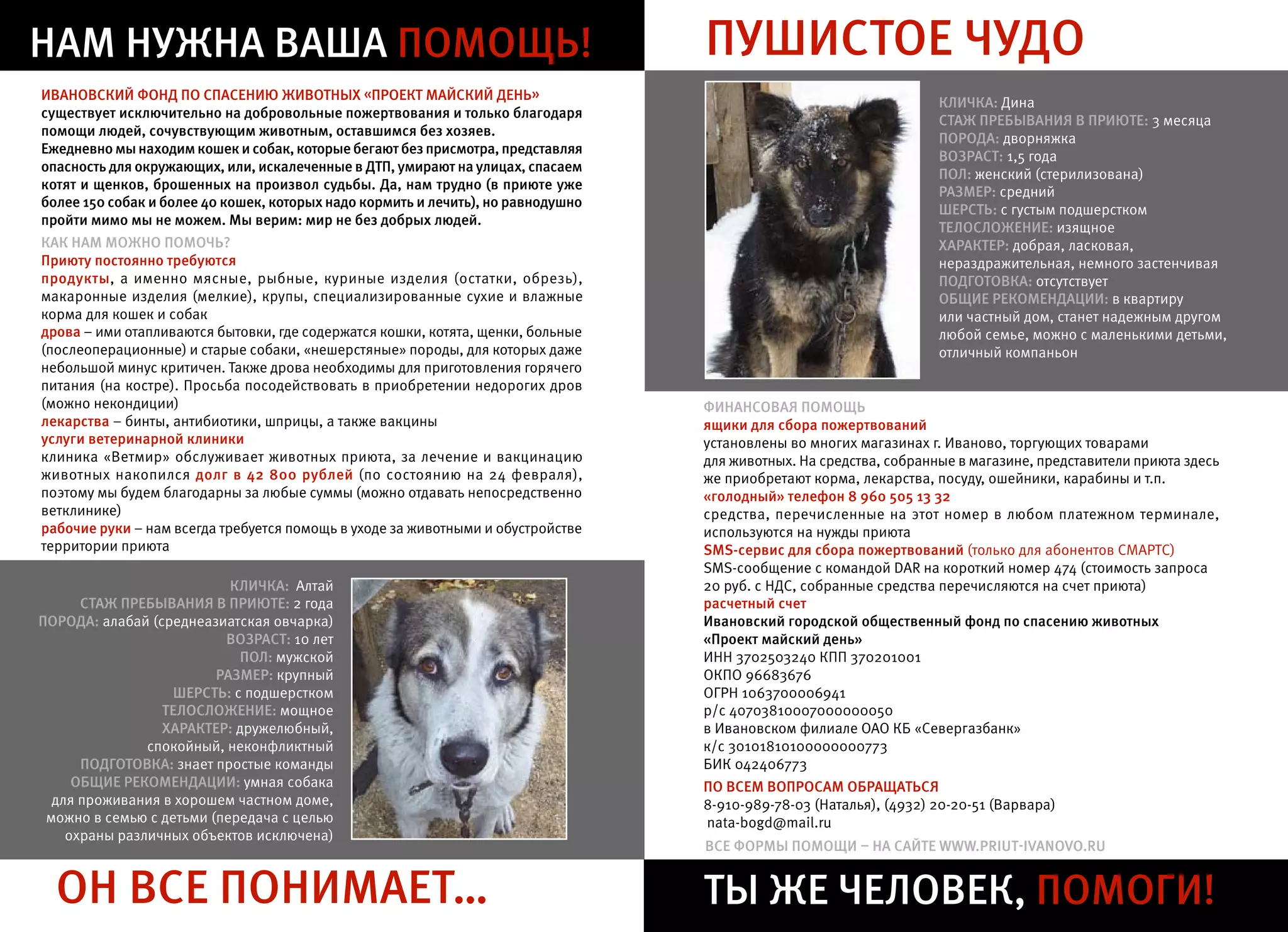 Ивановский фонд по спасению животных призывает к помощи для своего проекта 'Майский день', который поддерживается только на добровольные пожертвования. В приюте находится более 150 собак и 40 кошек, которым требуются питание, медицинские услуги и дрова. Фонд также предлагает различные способы помощи, включая денежные переводы и волонтерскую работу.