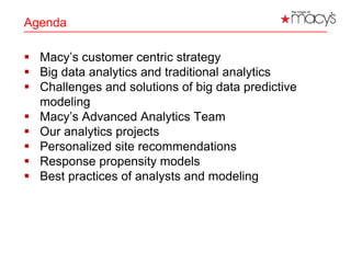 Macy's uses advanced analytics to improve the customer experience online and in stores. Their team builds predictive models to target customers with relevant products and information. Some of their projects include customer acquisition and retention modeling, personalized site recommendations, response propensity models, and using big data to better understand customer behavior. Their goal is to provide each customer with the best possible omnichannel shopping experience.