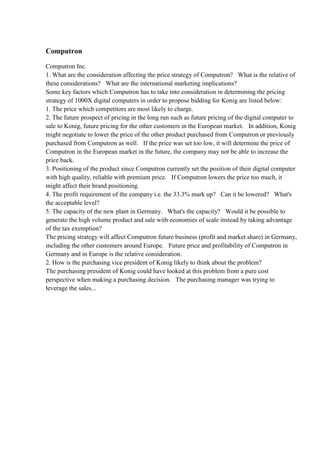 Computron is facing issues regarding pricing for its bid on the Computron 1000X computer for Konig and operating its new Frankfurt plant. The main concerns are that the bid cannot be over 20% of the lowest bid to win the contract, and top management will not allow pricing below a 33.3% markup. Other options are being considered like emphasizing quality over price due to past relationships, or waiting for future bids if this one is not successful. The summary analyzes factors affecting Computron's pricing strategy and how Konig's purchasing vice president may view the problem from a cost perspective.