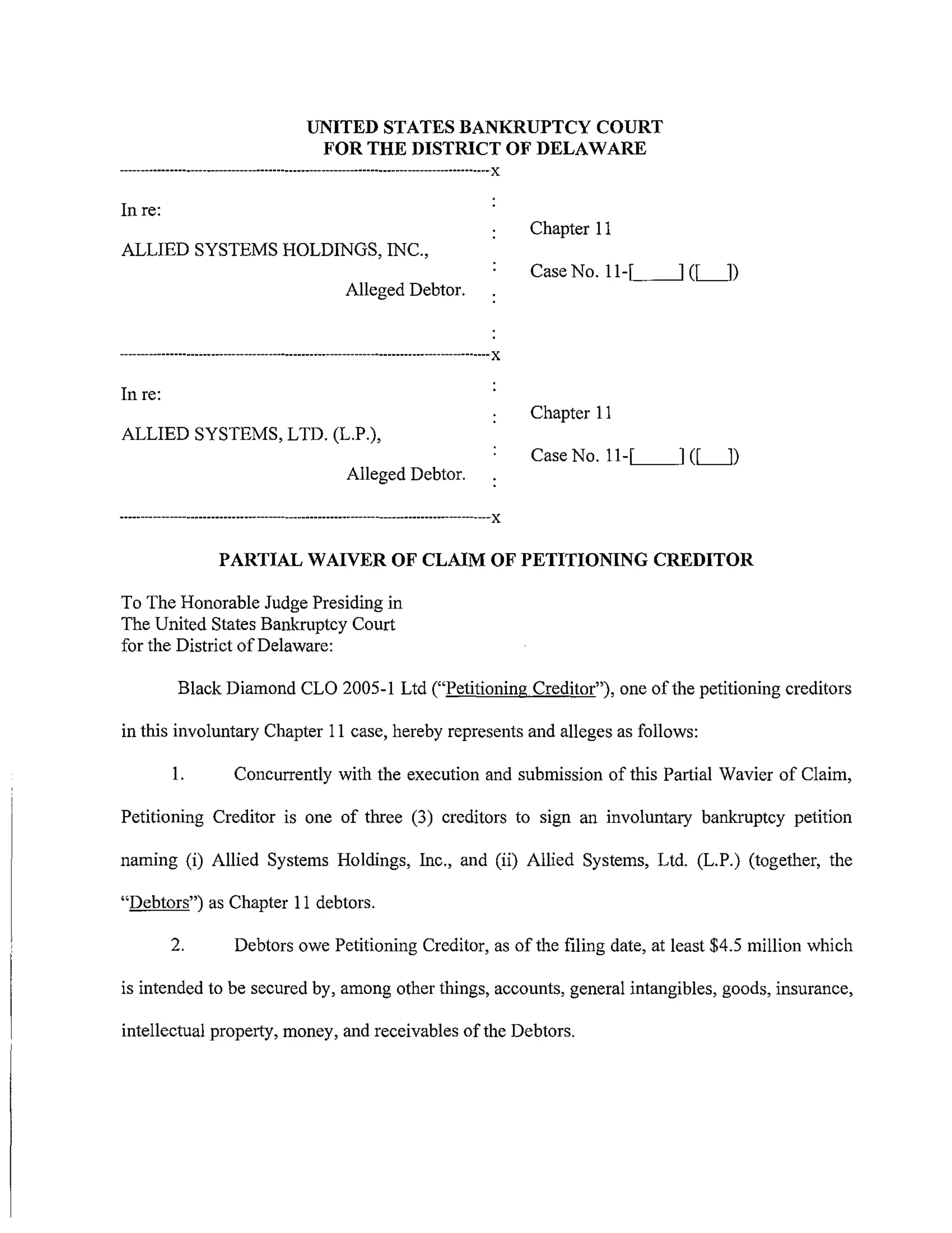 This document is a partial waiver of claim by Black Diamond CLO 2005-1 Ltd, one of the petitioning creditors in an involuntary Chapter 11 bankruptcy case against Allied Systems Holdings, Inc. and Allied Systems, Ltd. (L.P.). Black Diamond is owed over $4.5 million by the alleged debtors but waives up to $5,000 of its security interest to ensure it qualifies as an unsecured creditor along with two other petitioning creditors, meeting the $15,000 aggregate unsecured claims requirement to commence an involuntary bankruptcy case under Section 303(b) of the Bankruptcy Code.