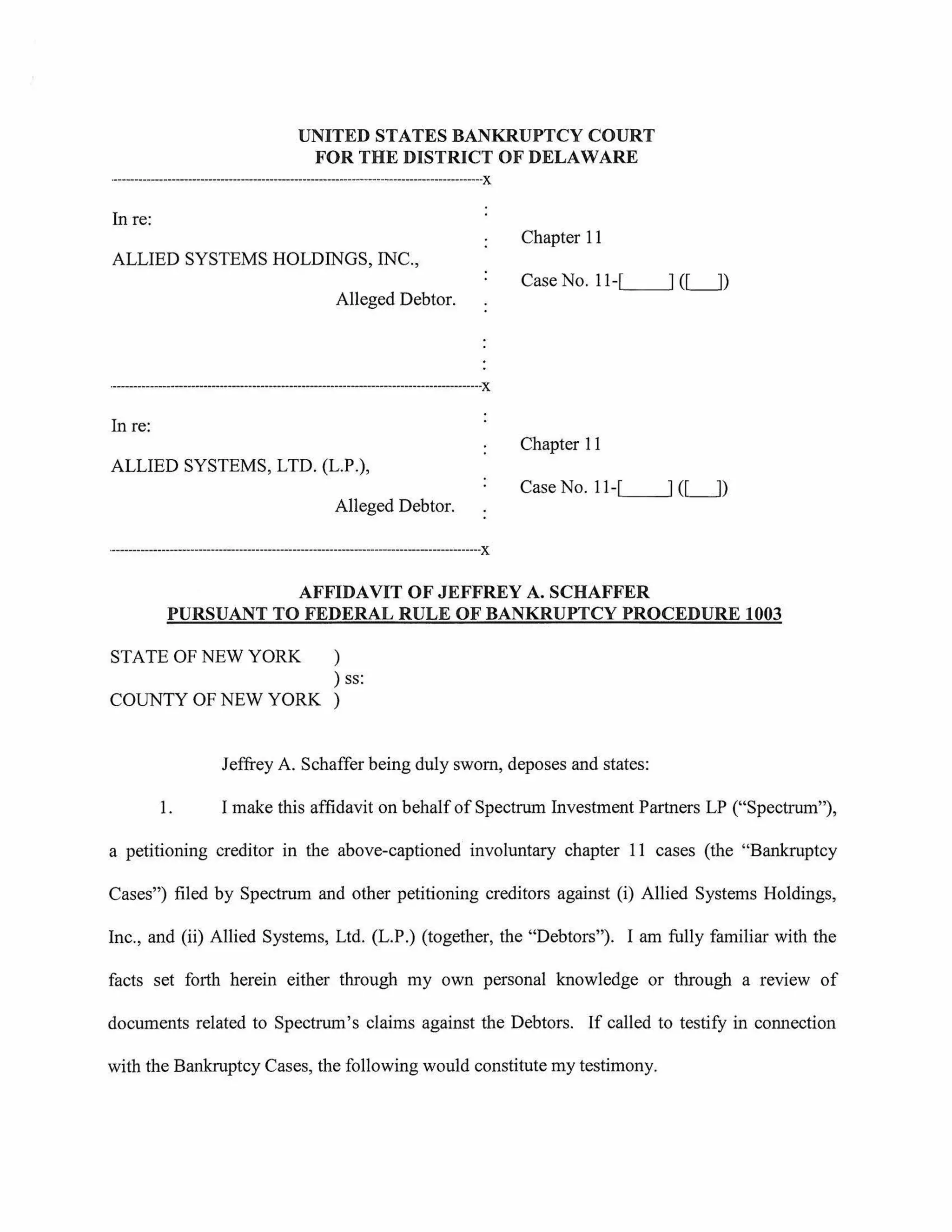 This affidavit provides testimony in support of an involuntary bankruptcy petition filed by Spectrum Investment Partners LP and other petitioning creditors against Allied Systems Holdings, Inc. and Allied Systems, Ltd. (L.P.). [1] Jeffrey Schaffer, the Managing Member of Spectrum Group Management LLC, which is the investment manager of Spectrum, states that [2] Spectrum is a creditor of the alleged debtors based on loans made under a 2007 first lien credit agreement, and is owed over $21.5 million. [3] The affidavit attaches documentation of assignments establishing Spectrum's status and claims as a creditor with standing to file the involuntary bankruptcy petition.