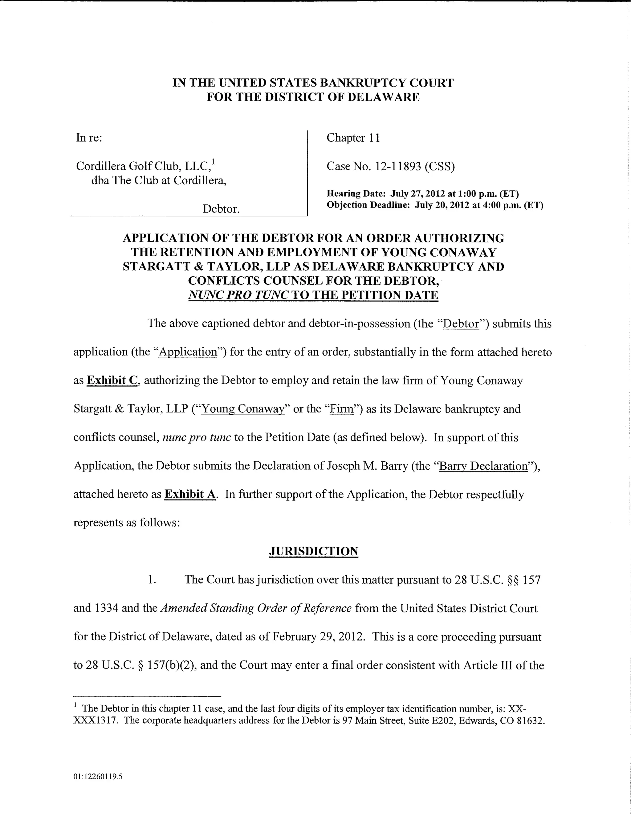 The debtor, Cordillera Golf Club, LLC, filed an application seeking approval to retain the law firm of Young Conaway Stargatt & Taylor, LLP ("Young Conaway") as its Delaware bankruptcy counsel. Young Conaway has extensive experience in bankruptcy matters and represented the debtor pre-petition. The application discloses Young Conaway's hourly rates, retention agreement with the debtor, and that the firm does not hold any interest adverse to the debtor or the bankruptcy estate. The debtor believes that retaining Young Conaway as Delaware bankruptcy counsel is in the best interests of the estate. A hearing on the application will be held on July 27, 2012.