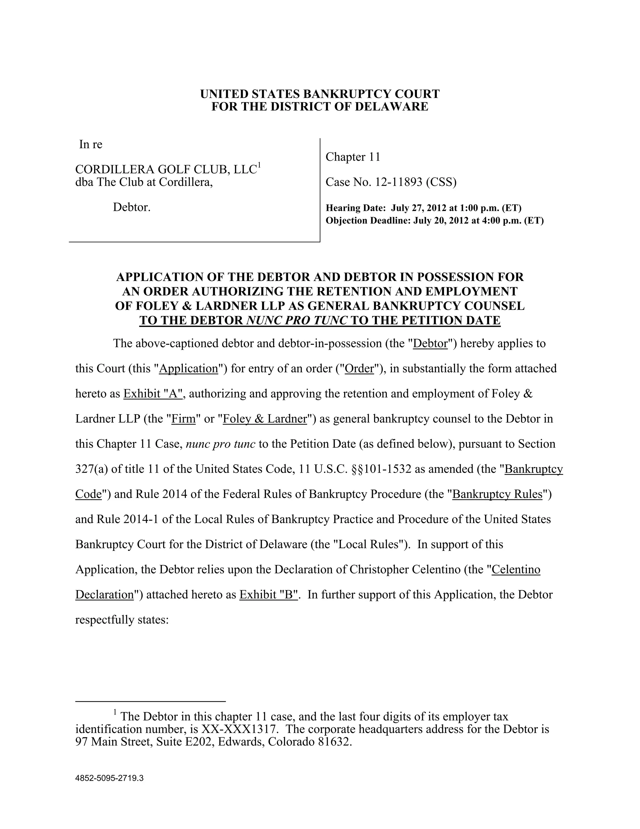 This document is an application filed by Cordillera Golf Club, LLC (the "Debtor") requesting that the Court approve the retention of Foley & Lardner LLP ("Foley") as the Debtor's general bankruptcy counsel. The application provides background on the Debtor's Chapter 11 bankruptcy filing and describes Foley's qualifications to serve as counsel. It also discloses Foley's prior representation of the Debtor as well as certain affiliates, and requests authorization for Foley to continue representing those parties in unrelated matters, provided there is no conflict with the bankruptcy case. Notice of the application will be provided to key parties, and the Debtor requests approval of Foley's retention nunc pro tunc to the