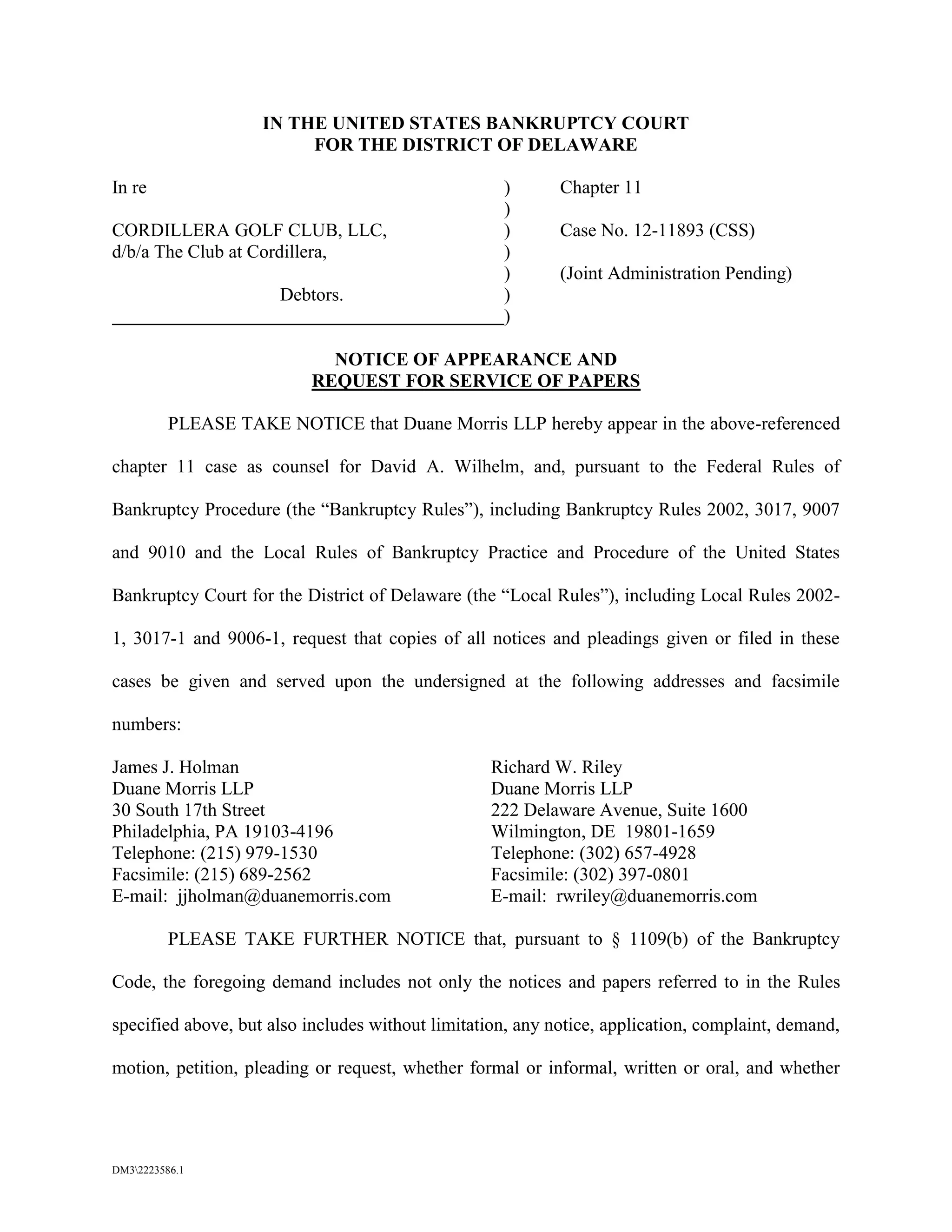This document is a notice of appearance filed by Duane Morris LLP in the bankruptcy case of Cordillera Golf Club, LLC. Duane Morris LLP represents David A. Wilhelm in the case and requests that all notices and filings be served on them. The notice reserves all rights of David A. Wilhelm, including the right to a jury trial, withdrawal of reference, and any defenses or claims allowed under law or equity.