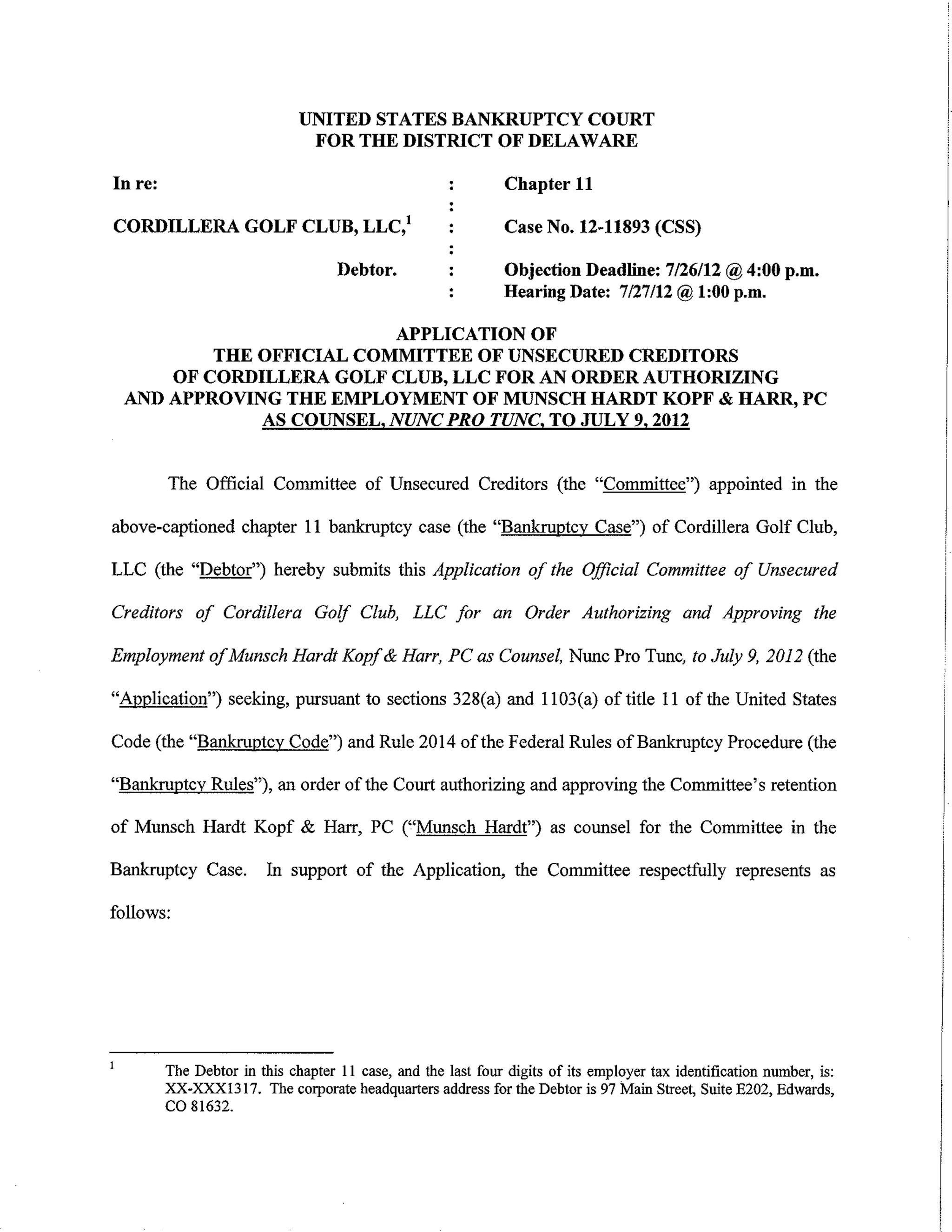 The Official Committee of Unsecured Creditors appointed in Cordillera Golf Club, LLC's Chapter 11 bankruptcy case filed an application seeking court approval to retain Munsch Hardt Kopf & Harr, PC as its legal counsel. The Committee selected Munsch Hardt due to the firm's experience in bankruptcy matters and issues relevant to the case. The application requests approval of Munsch Hardt's hourly rates and reimbursement of expenses, and asserts that the firm is qualified and disinterested to represent the Committee. Notice of the application will be provided to parties in the bankruptcy case. A hearing on the application is scheduled for July 27, 2012.