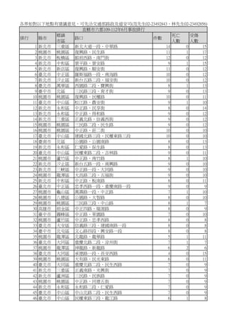 新北市 三重區 新北大道一段、中華路 14 0 15 2 桃園市 桃園區 復興路、民生路 11 1 17 3 新北市 板橋區 館前西路、南門街 12 0 12 4 新北市 中和區 景平路、景安路 9 1 15 5 新北市 新店區 復興路、順安街 11 0 12 6 臺北市 中正區 羅斯福路一段、南海路 10 0 12 7 新北市 汐止區 新台五路二段、福安街 10 0 12 8 臺北市 萬華區 西園路二段、寶興街 8 1 13 9 臺中市 北區 三民路三段、育才街 9 0 13 10 桃園市 桃園區 復興路、民權路 10 0 11 11 臺北市 中山區 松江路、農安街 9 1 10 12 新北市 永和區 中正路、民享街 8 0 14 13 新北市 永和區 中正路、得和路 9 0 12 14 新北市 三重區 正義北路、信義西街 9 0 12 15 桃園市 桃園區 三民路二段、民生路 9 0 12 16 桃園市 桃園區 中正路、莊二街 10 0 10 17 臺北市 中山區 建國北路三段、民權東路三段 10 0 10 18 臺南市 北區 公園路、公園南路 8 0 13 19 新北市 永和區 仁愛路、保生路 8 0 13 20 臺北市 中山區 民權東路二段、吉林路 9 0 11 21 桃園市 蘆竹區 中正路、南竹路 8 1 10 22 新北市 汐止區 新台五路一段、南興路 9 0 10 23 新北市 三峽區 中正路一段、大同路 9 0 10 24 桃園市 龍潭區 大昌路二段、五福街 9 0 10 25 新北市 中和區 中正路、板南路 8 0 11 26 臺北市 中正區 忠孝西路一段、重慶南路一段 9 0 9 27 桃園市 龜山區 萬壽路一段、中正路 7 1 10 28 桃園市 八德區 公園路、大智路 8 0 10 29 桃園市 桃園區 三民路三段、中山路 8 1 7 30 高雄市 前金區 中正四路、瑞源路 8 0 9 31 臺中市 霧峰區 中正路、萊園路 7 0 10 32 桃園市 蘆竹區 中正路、忠孝西路 8 0 8 33 臺北市 大安區 信義路三段、建國南路一段 8 0 8 34 臺中市 北屯區 文心路四段、興安路一段 8 0 8 35 桃園市 龍潭區 北龍路、龍華路 5 1 11 36 臺北市 大同區 重慶北路二段、涼州街 7 1 7 37 桃園市 龍潭區 神龍路、新龍路 6 2 6 38 臺北市 大同區 承德路一段、長安西路 4 0 15 39 桃園市 桃園區 大有路、民光東路 6 0 11 40 臺北市 大同區 重慶北路二段、民生西路 7 0 9 41 新北市 三重區 正義南路、光興街 7 0 9 42 新北市 蘆洲區 三民路、民族路 7 0 9 43 桃園市 桃園區 中正路、同德五街 7 0 9 44 新北市 永和區 永和路二段、仁愛路 7 0 9 45 臺北市 中山區 中山北路二段、民生西路 7 0 9 46 臺北市 中山區 民權東路三段、龍江路 6 1 8 直轄市六都109-112年6月事故排行 各界如對以下地點有建議意見,可先洽交通部路政及道安司(范先生02-23492843、林先生02-23492856)