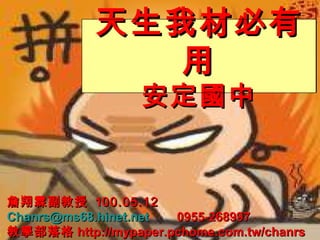 詹翔霖副教授的文檔介紹了其學術背景、職業經歷及自我探索的重要性,強調個人特質、價值觀和興趣在生涯規劃中的角色。此外,文檔探討了幸福、成就以及自我成長的必要性,並提供了多種方法幫助人們在生活中設立目標和追求快樂。