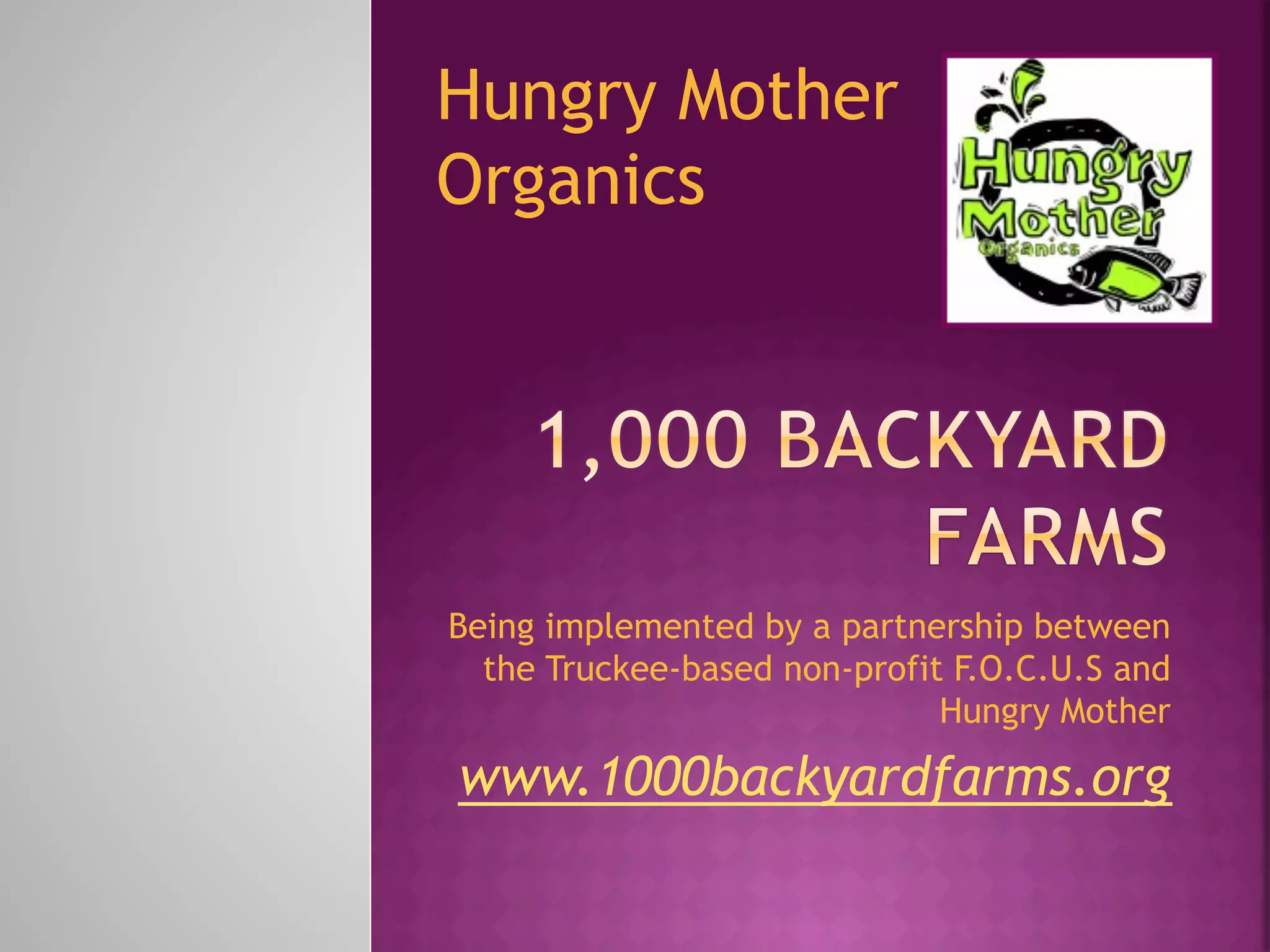 Hungry Mother Organics is a partnership aimed at empowering citizens to grow their own food, targeting a goal of getting 1,000 individuals to participate in backyard farming. The initiative promotes various small-scale gardening techniques that enhance self-sufficiency and community food sharing. Examples from successful urban farms and local gardening organizations illustrate the potential benefits and educational value of these practices.