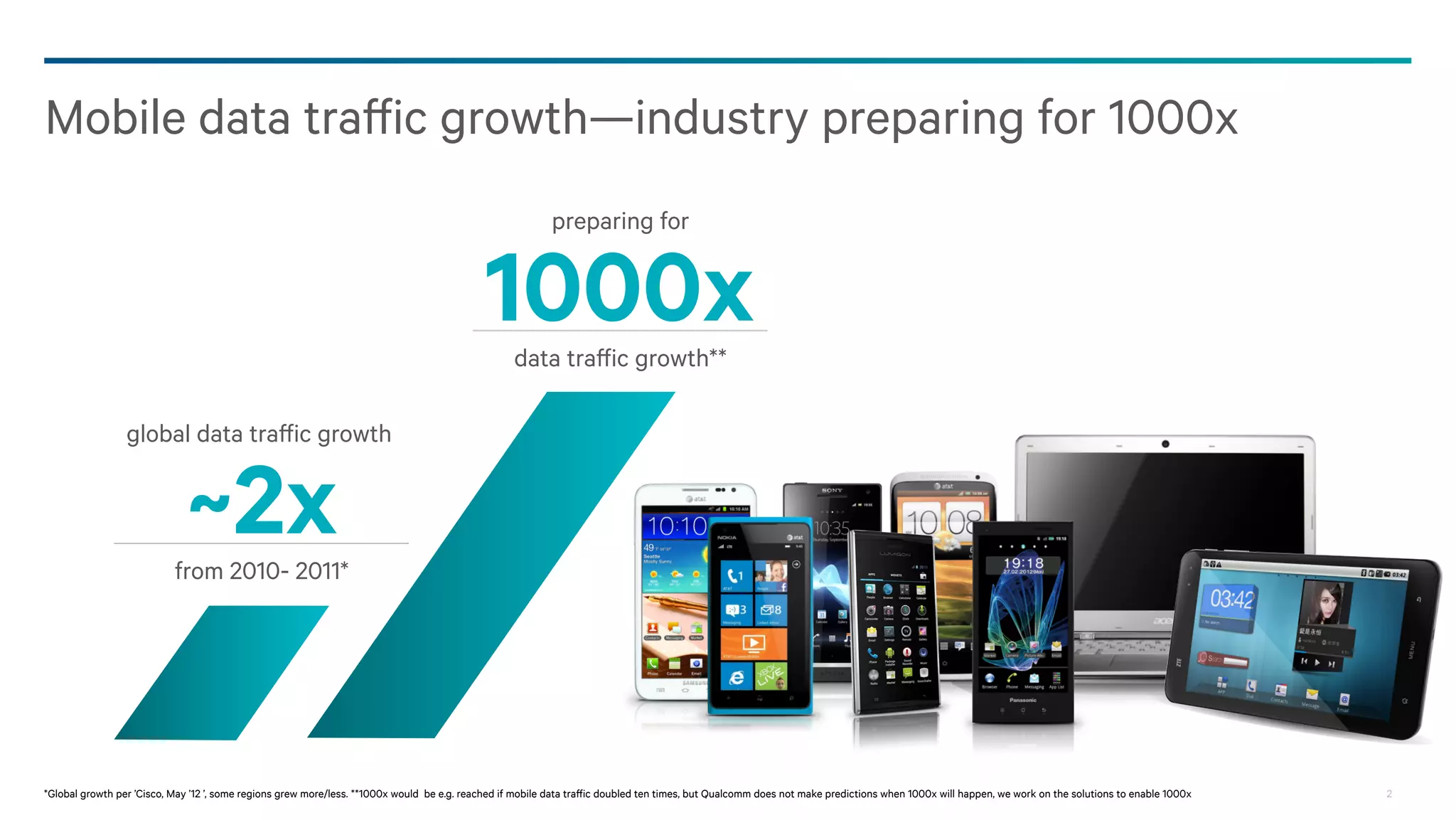 The document discusses the need for innovative approaches to manage the anticipated 1000x increase in mobile data traffic due to smartphone growth and richer content consumption. It highlights various strategies such as optimizing spectrum usage, enhancing application efficiency, and utilizing advanced technologies like LTE broadcast and device-to-device communication. Qualcomm is focused on developing solutions that combine network efficiency with improved user experiences across multiple devices and services.